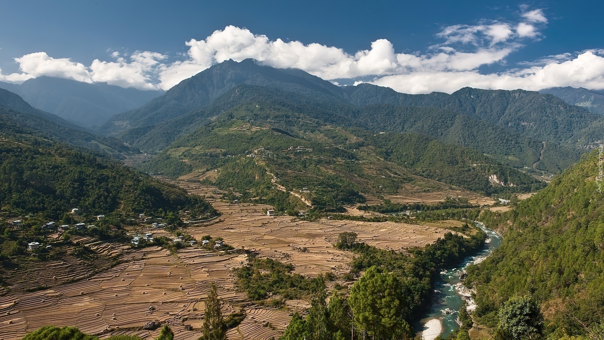 Edytor tapety: Góry, Pola, Łąki, Rzeka