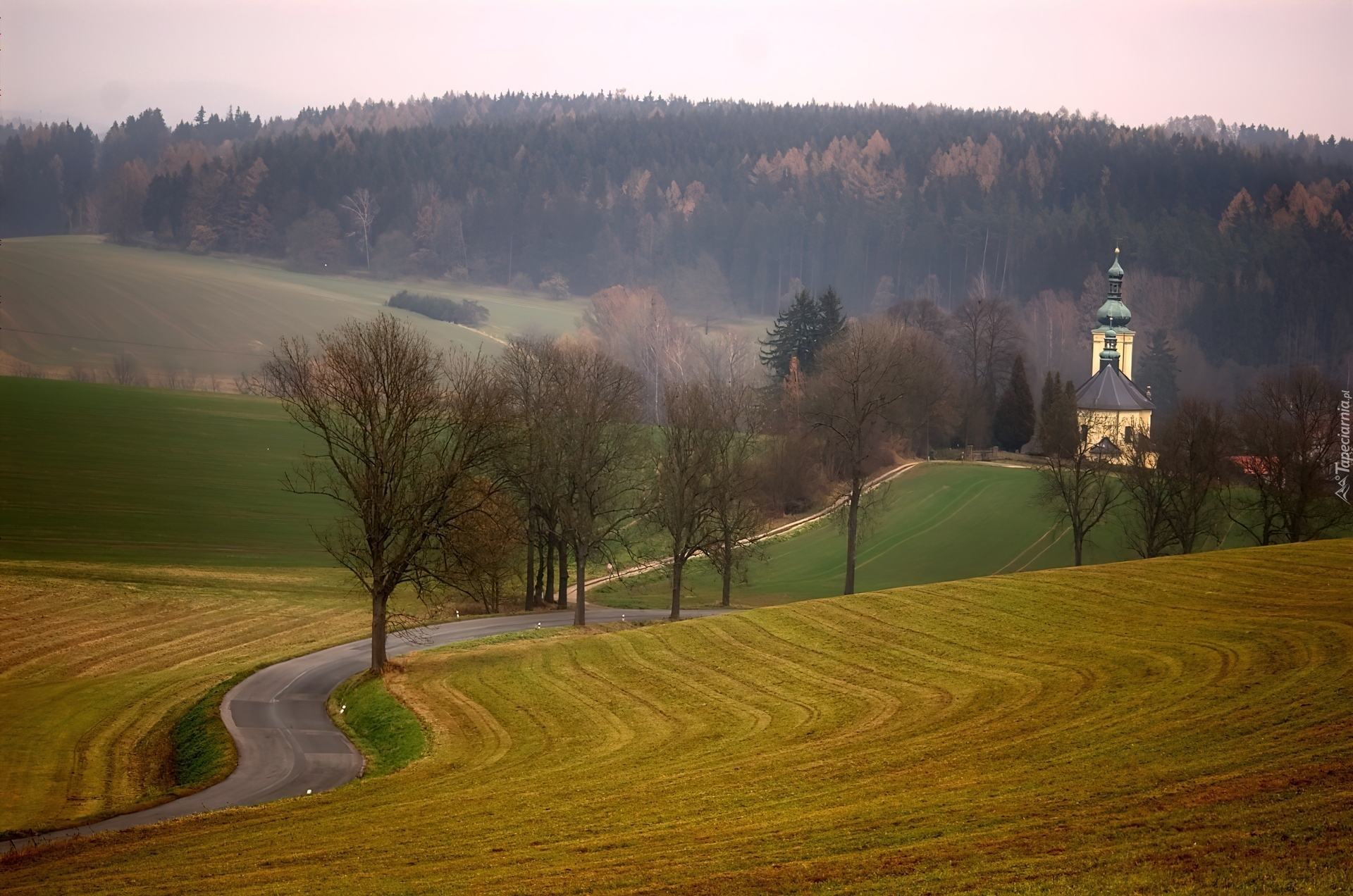 Edytor tapety: Góry, Droga, Drzewa, Pole, Budynki, Las