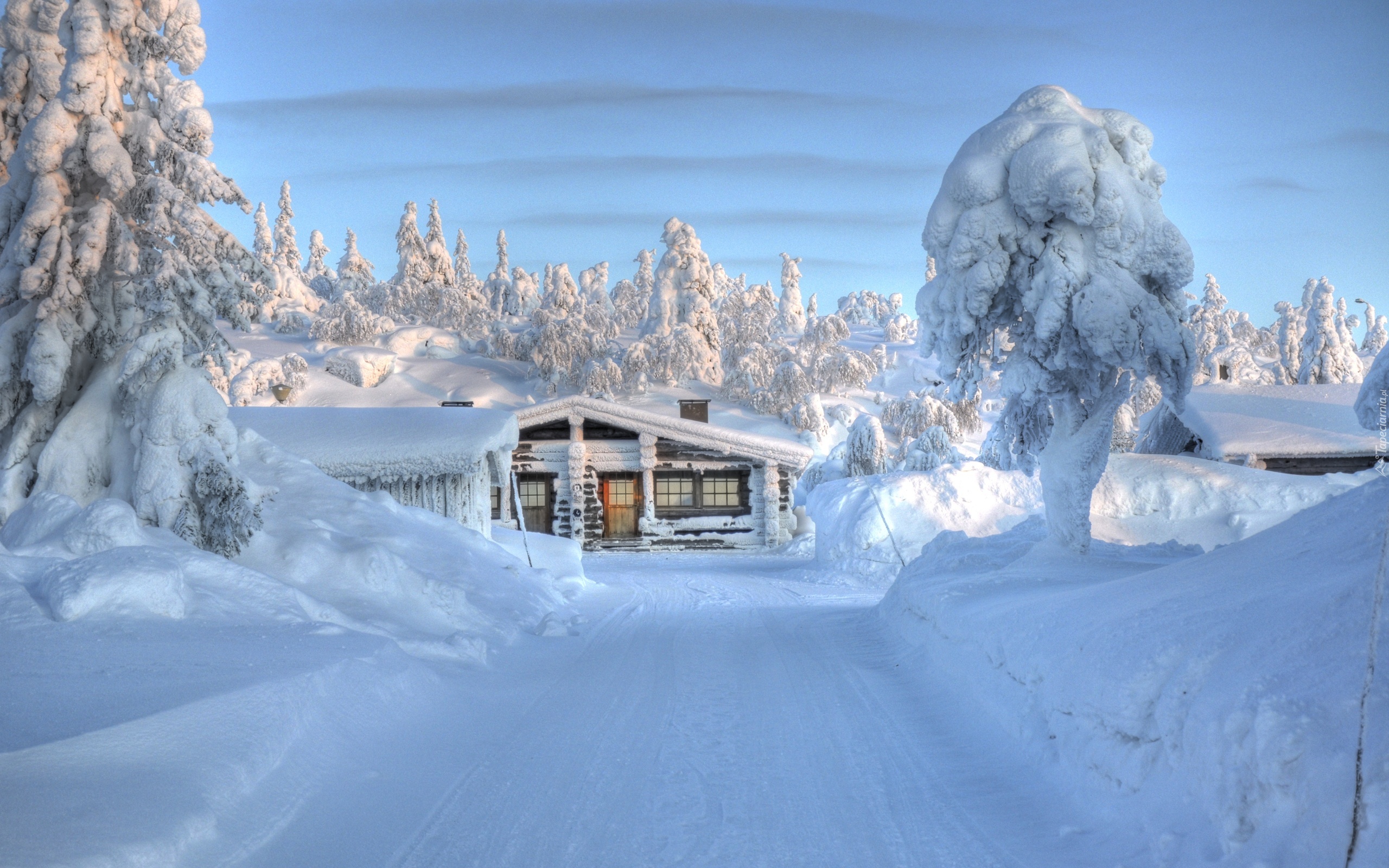 Edytor tapety: Droga, Domek, Drzewa, Śnieg