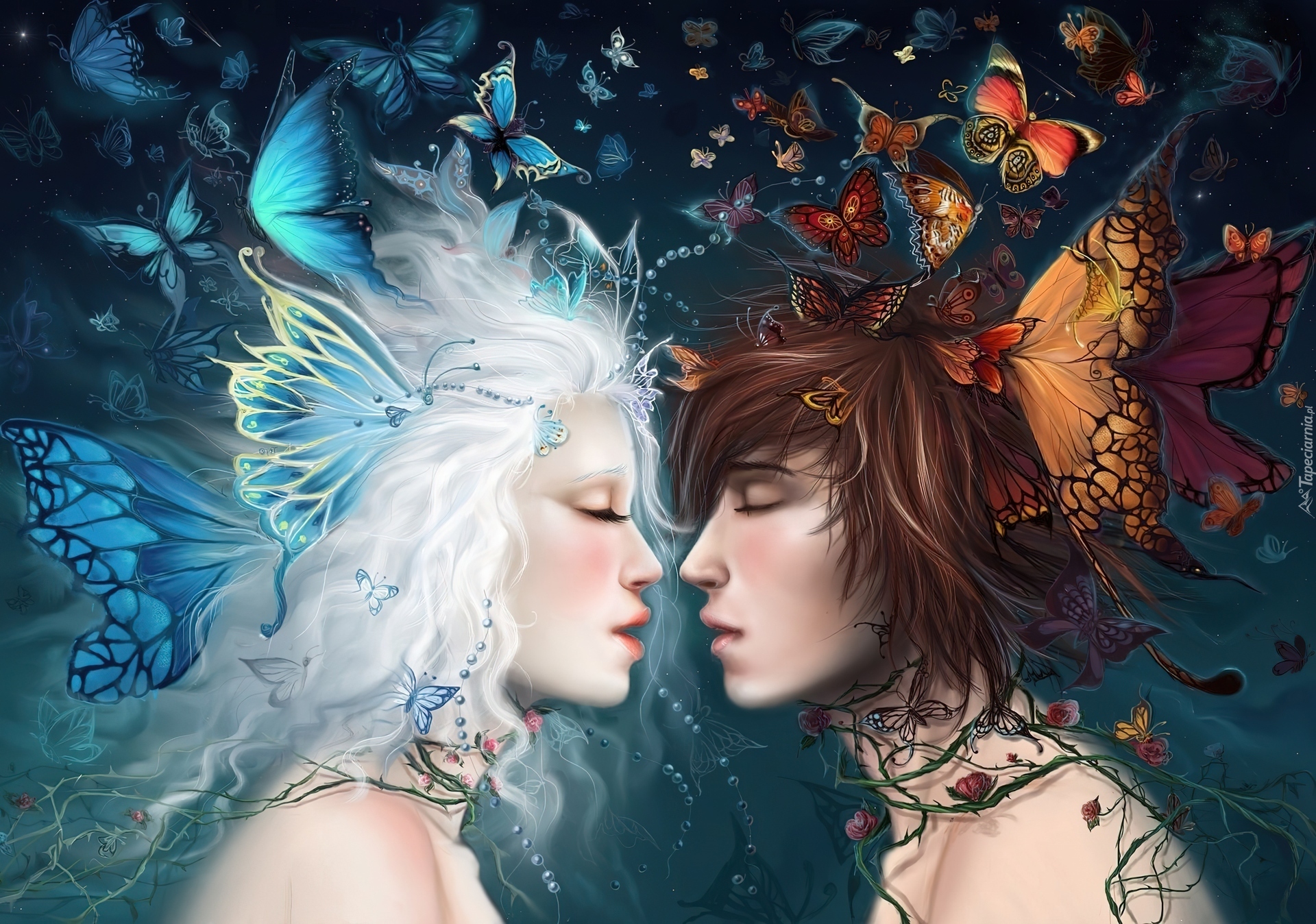 Edytor tapety: Dwie, Kobiety, Rozwichrzone, Włosy, Kolorowe, Motyle