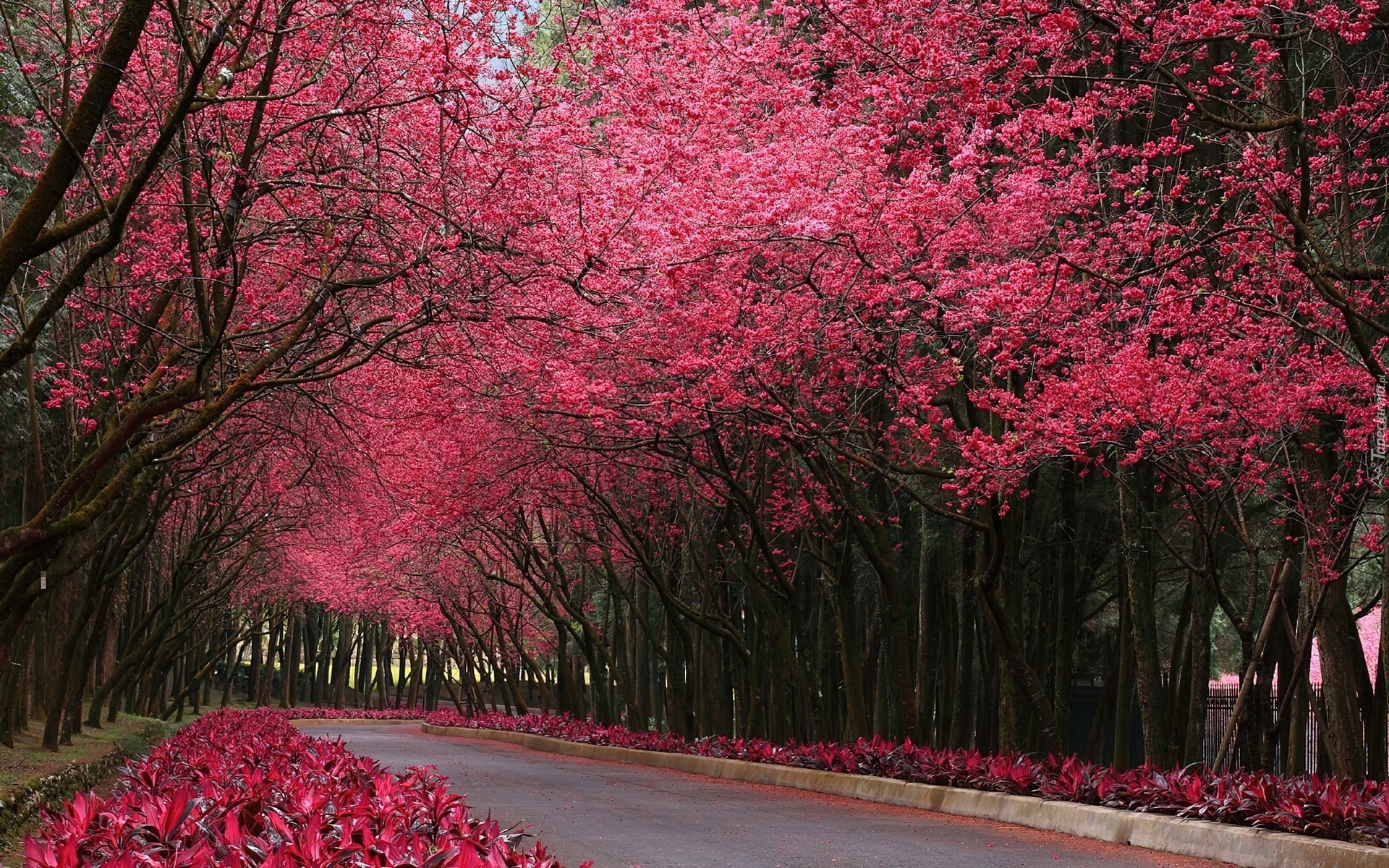 Edytor tapety: Droga, Kwitnące, Różowe, Drzewa
