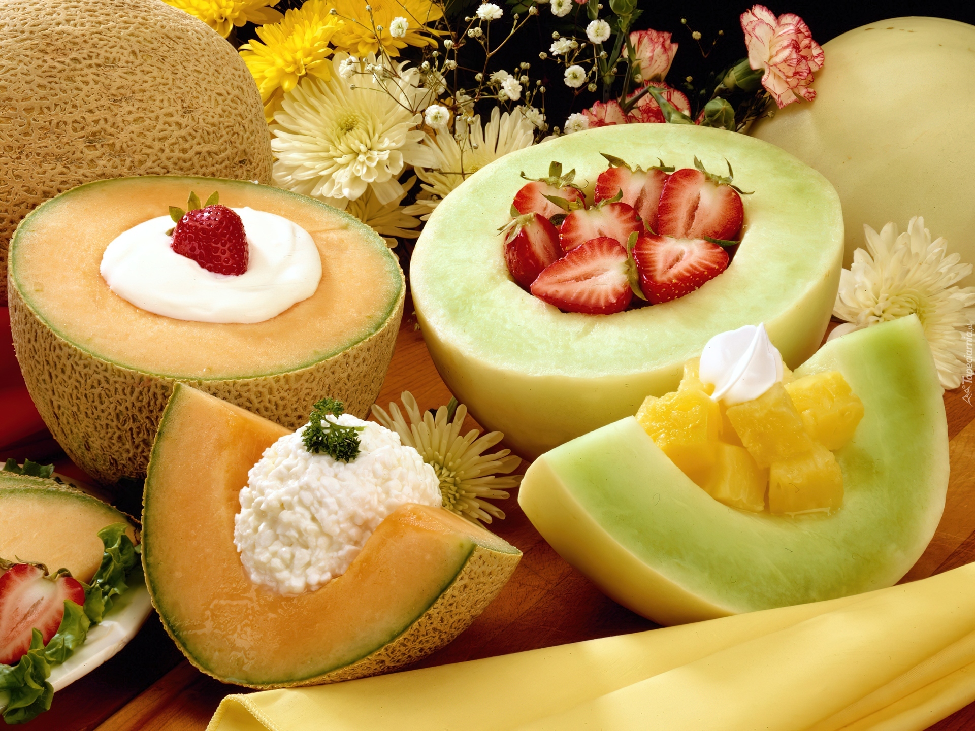 Edytor tapety: Melony, Truskawki, Twarożek, Kwiaty