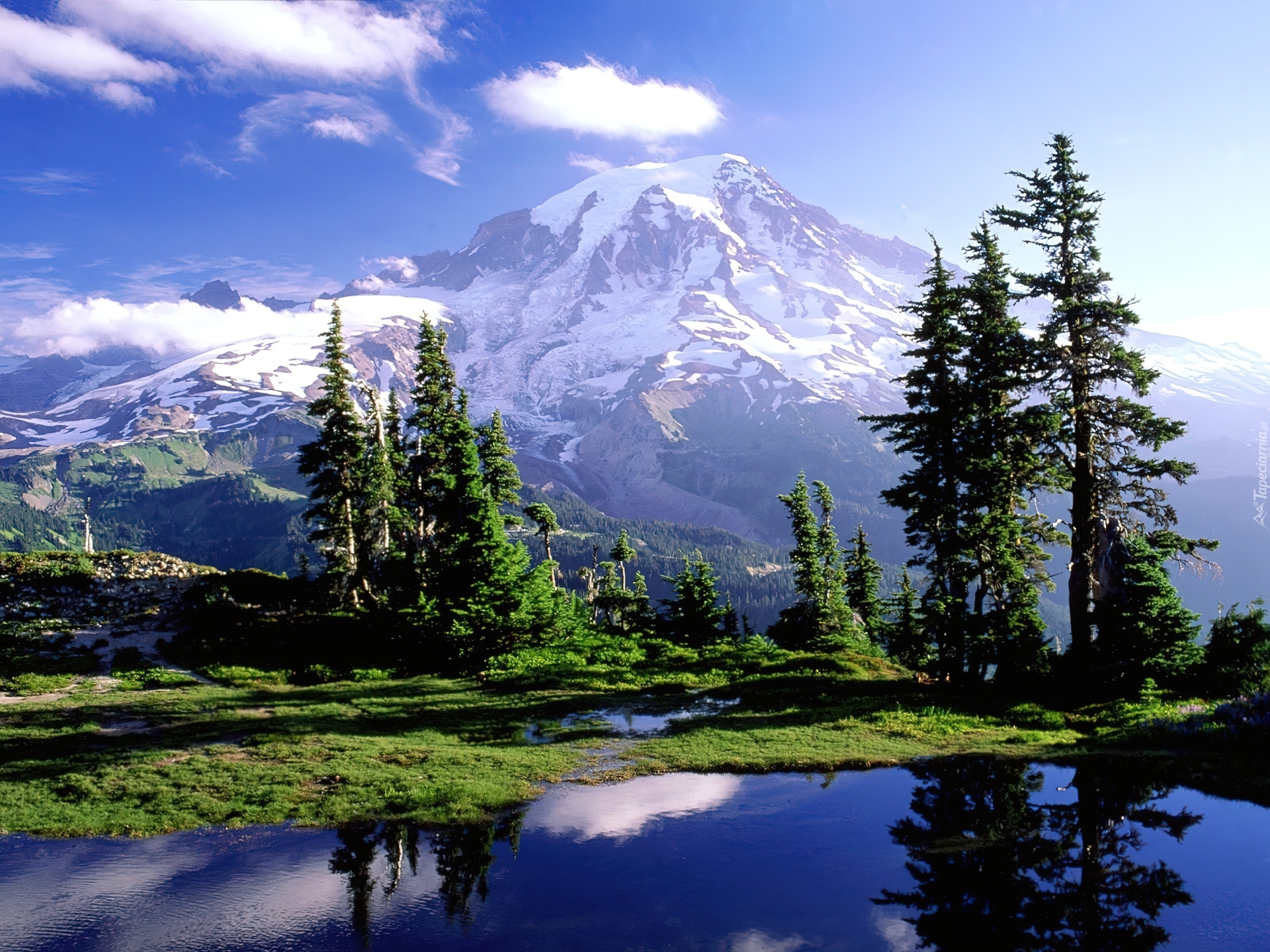 Edytor tapety: Ośnieżone, Szczyty, Górskie, Śnieg, Góry, Jezioro, Świerki