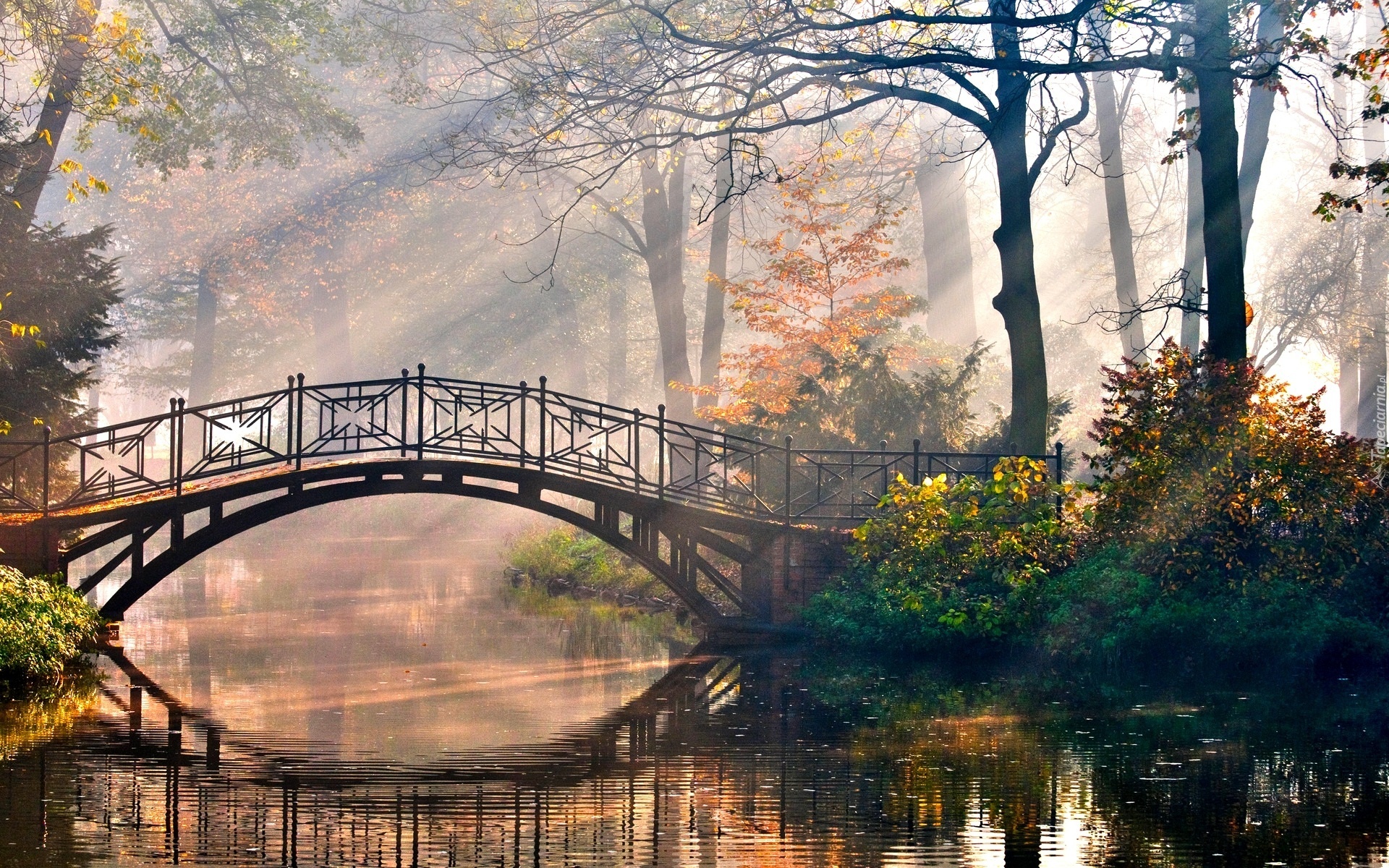 Edytor tapety: Park, Drzewa, Mostek, Rzeczka, Promienie, Słoneczne