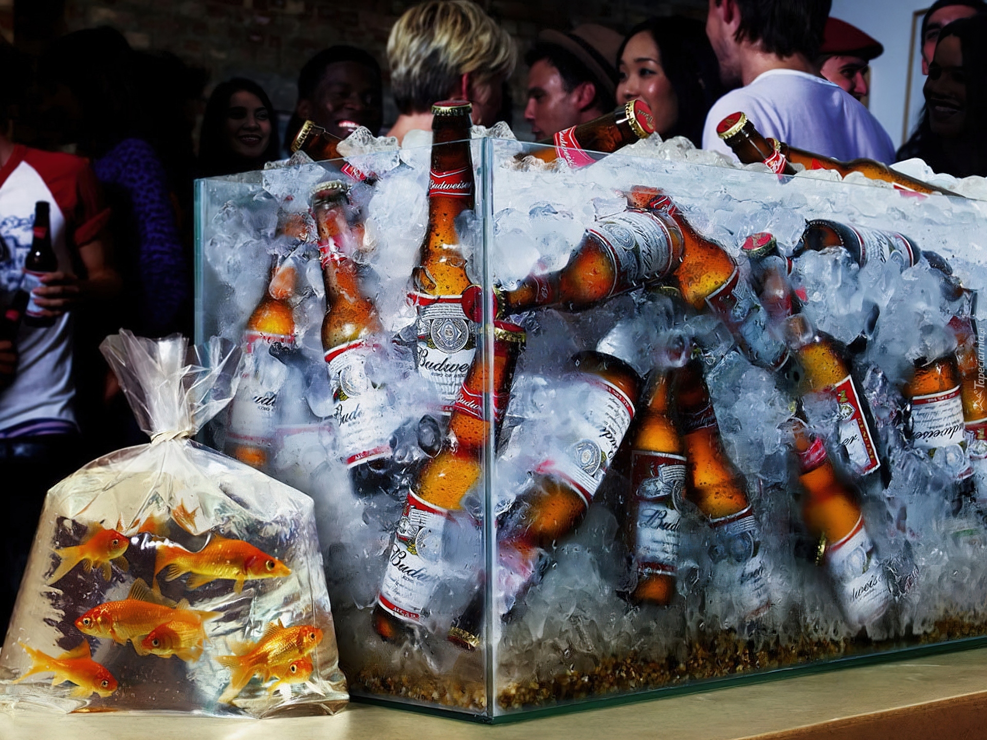 Edytor tapety: Piwo, Lód, Akwarium, Rybki, Budweiser