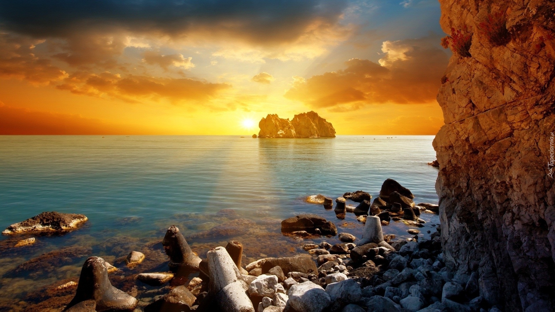 Edytor tapety: Wybrzeże, Morze, Kamienie, Klify, Zachód, Słońca