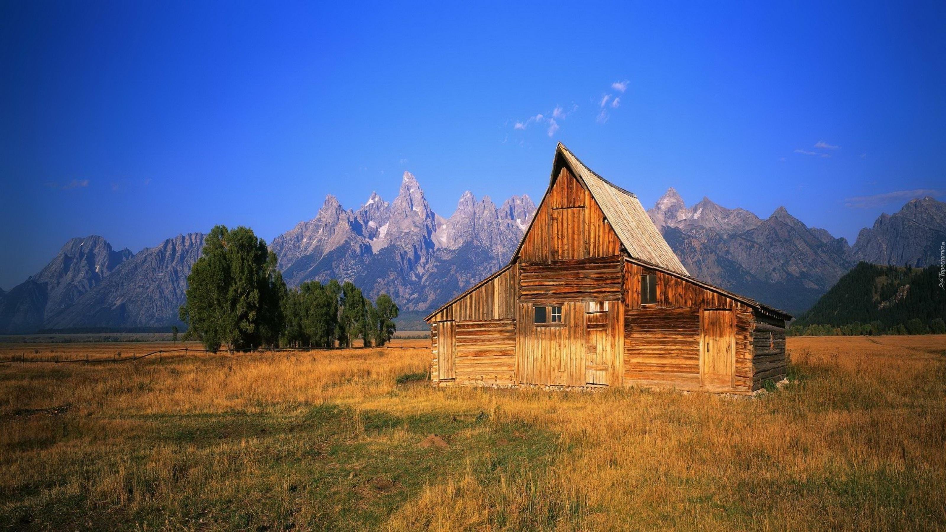 Edytor tapety: Góry, Domek, Drewniany, Drzewa, Trawa