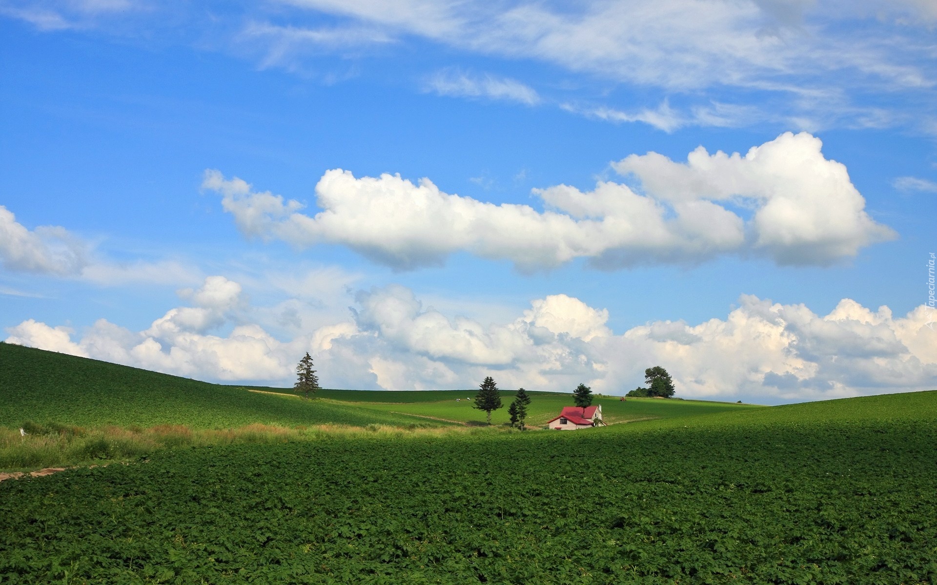 Edytor tapety: Chmury, Pole, Drzewa, Domek