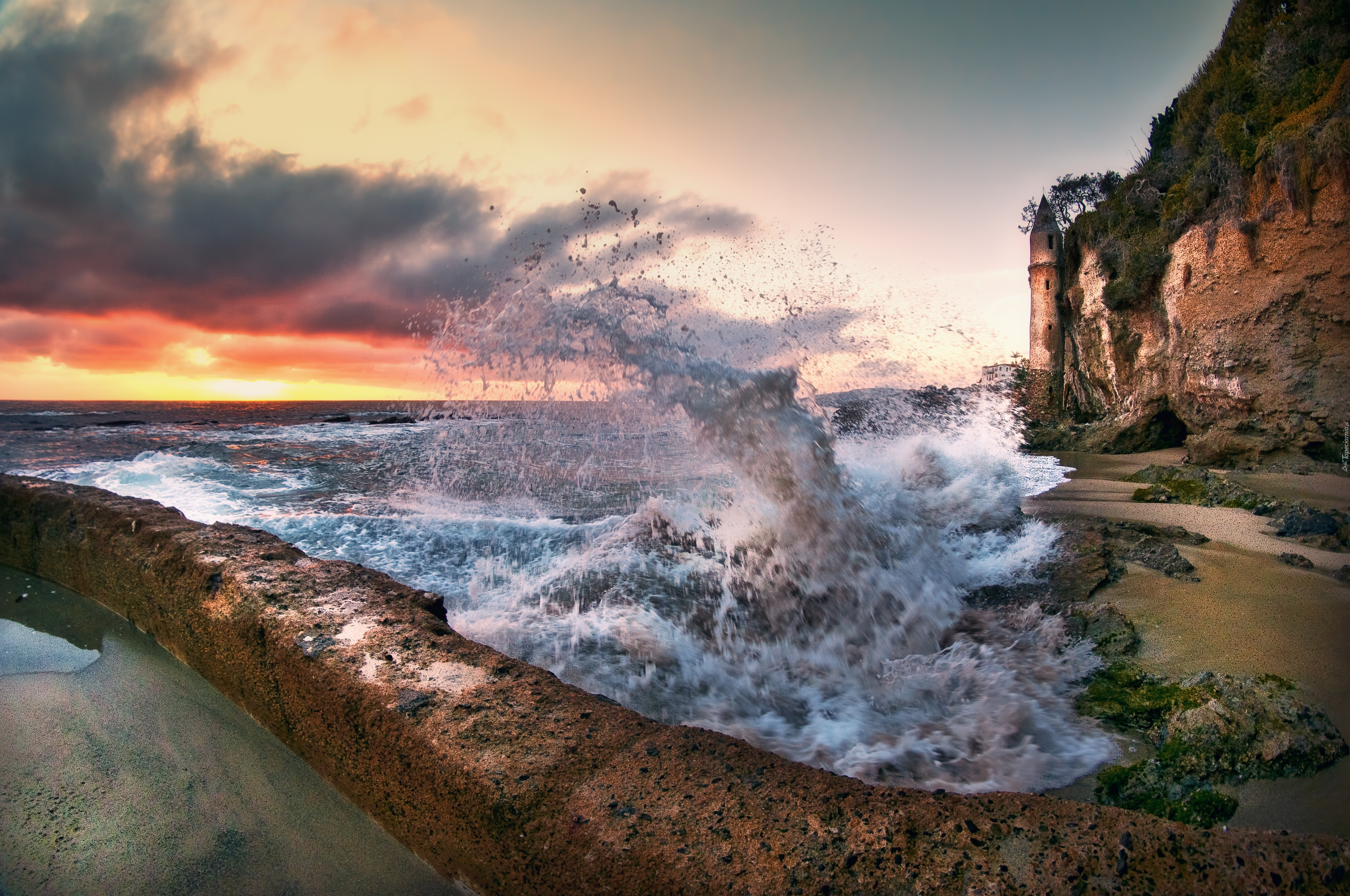 Edytor tapety: Ruiny, Zamku, Morze, Fale, Chmury