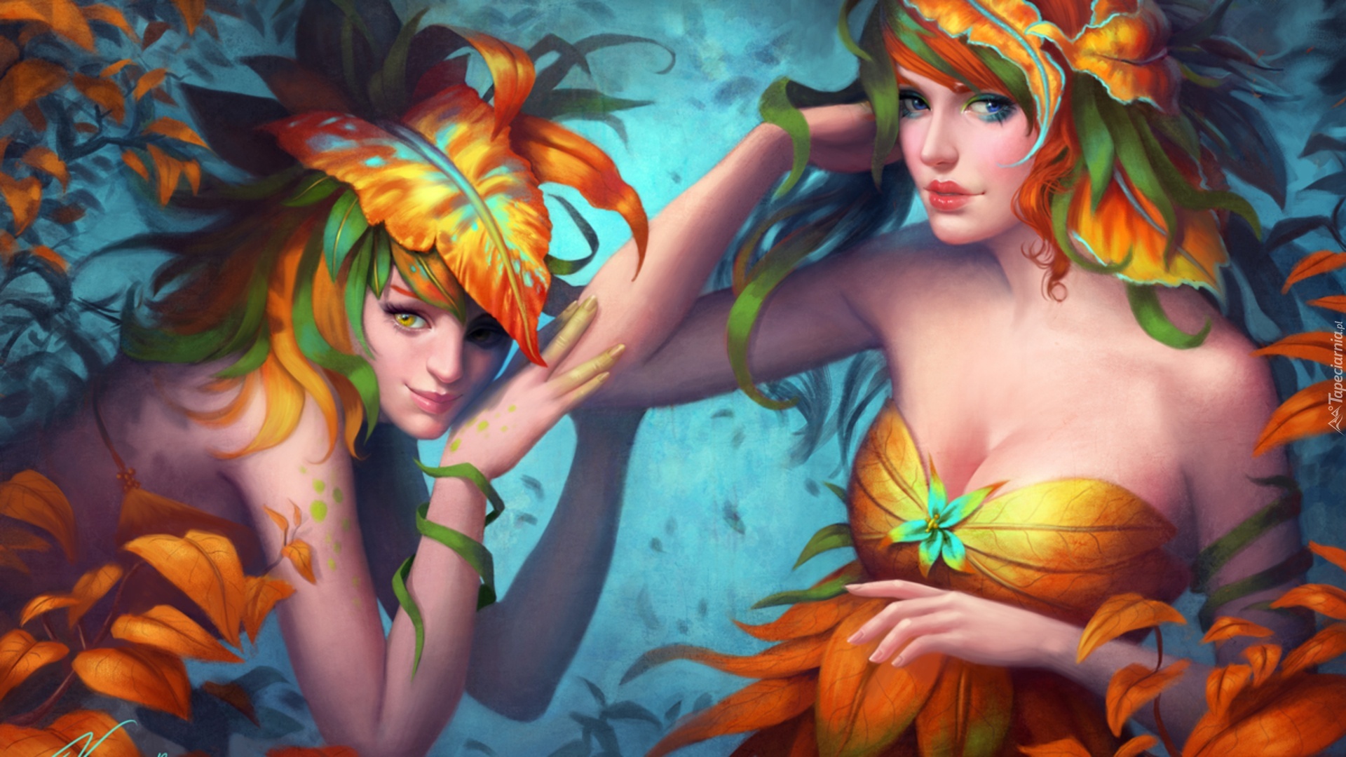 Edytor tapety: Dwie, Dziewczyny, Liście, Grafika