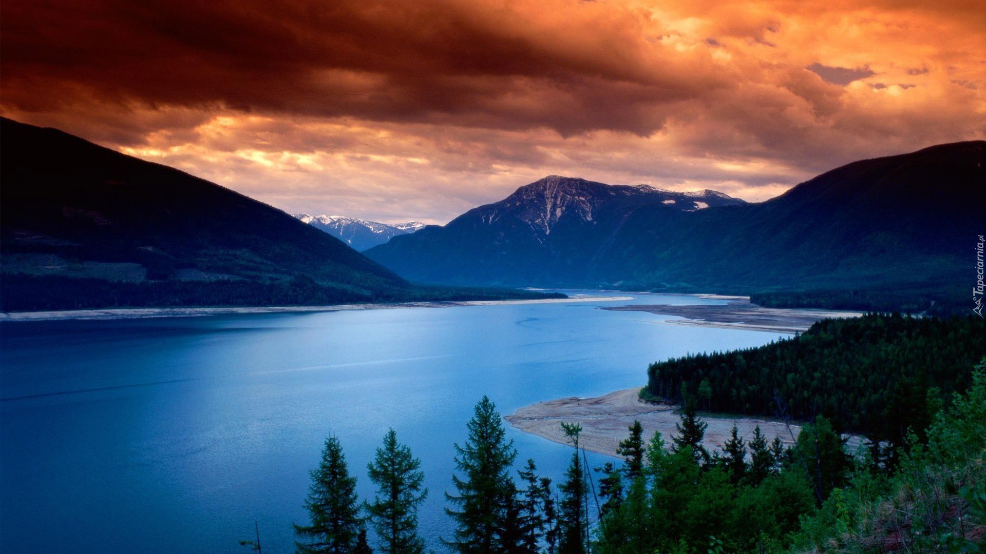 Edytor tapety: Jezioro, Plaża, Góry, Drzewa, Zachód, Słońca