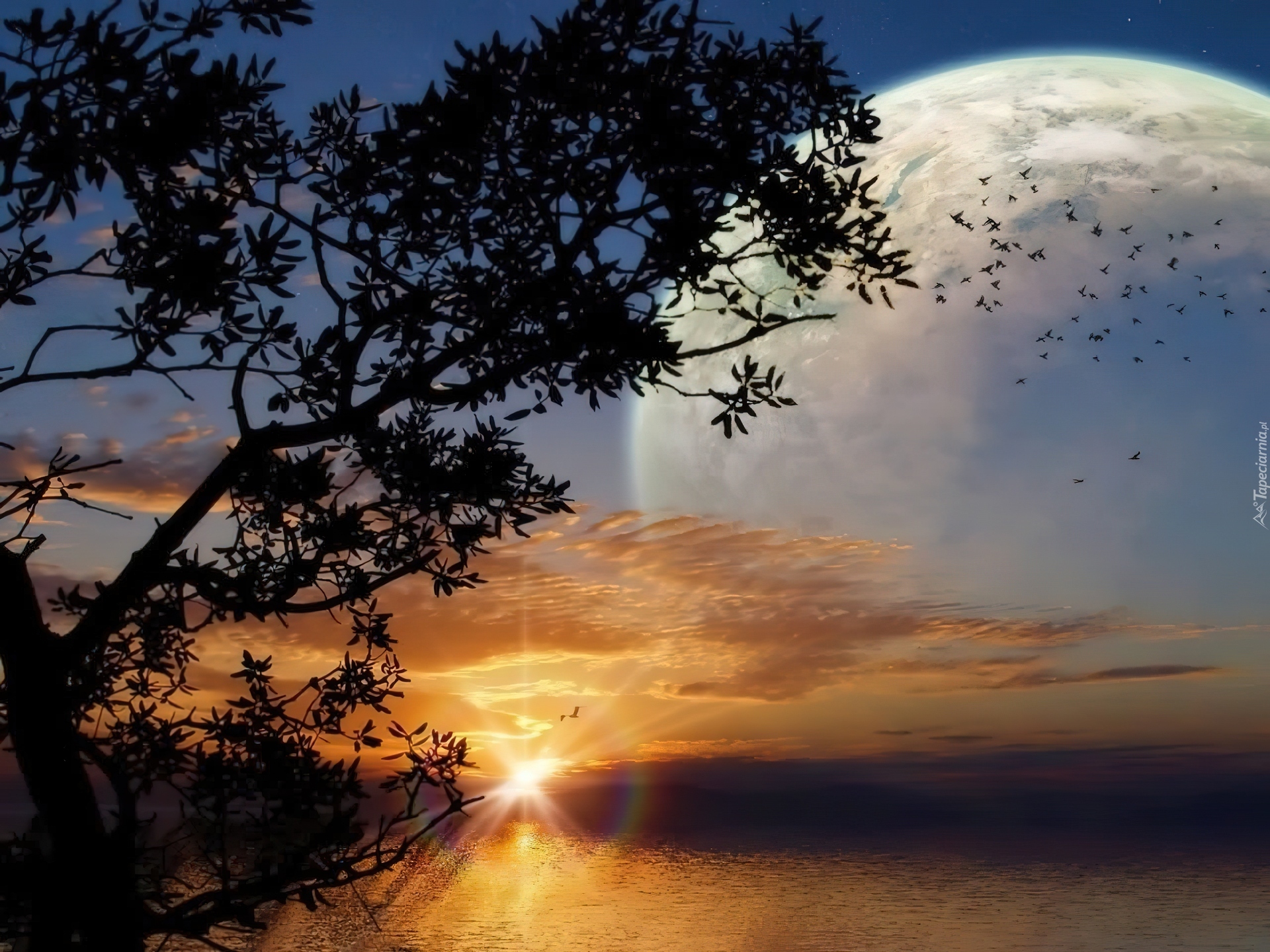 Edytor tapety: Zachód, Słońca, Drzewo, Ptaki