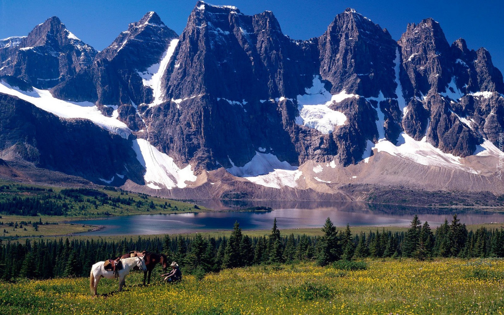 Edytor tapety: Góry, Jezioro, Łąka, Konie