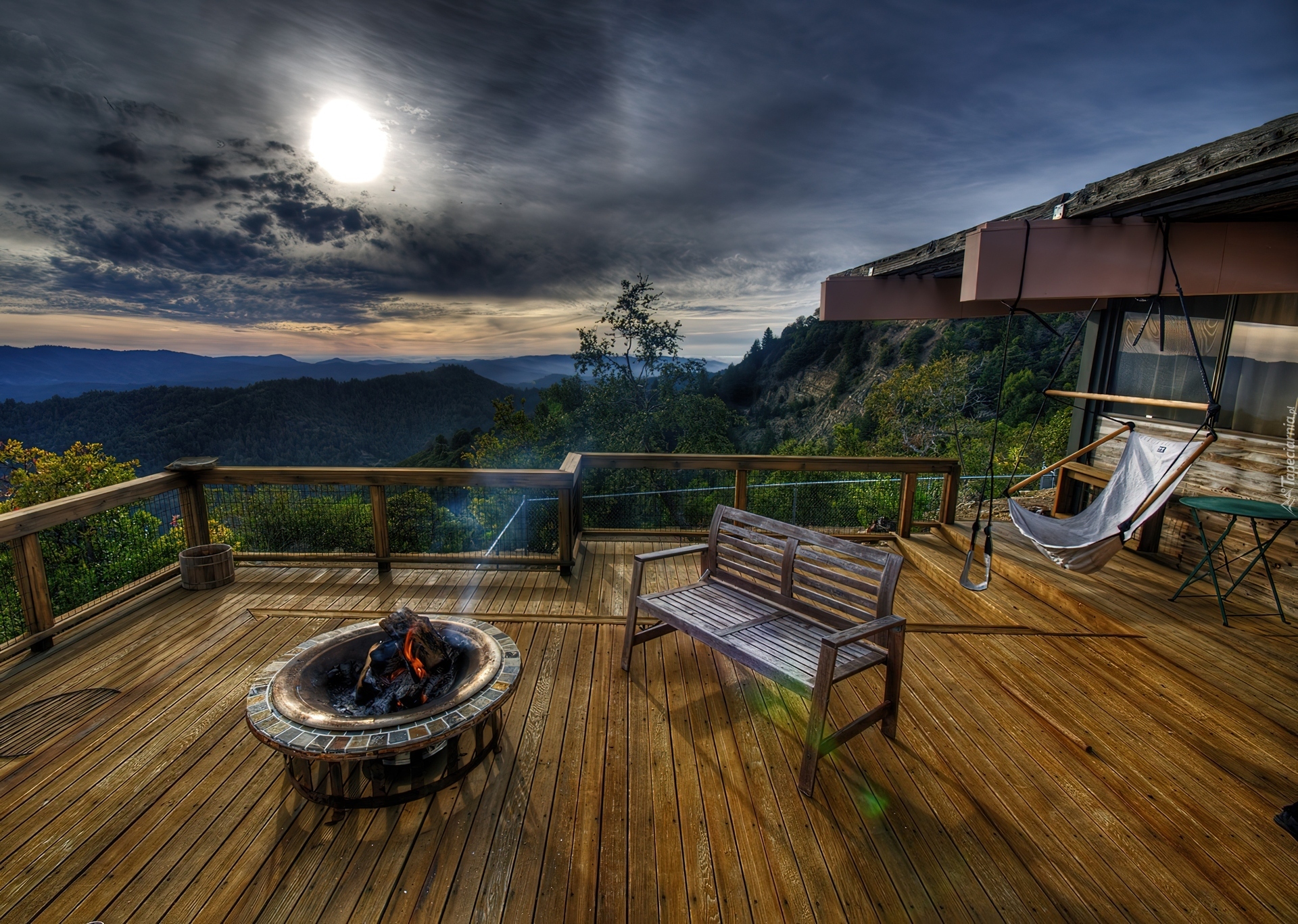 Edytor tapety: Zachód, Słońca, Chmury, Góry, Taras