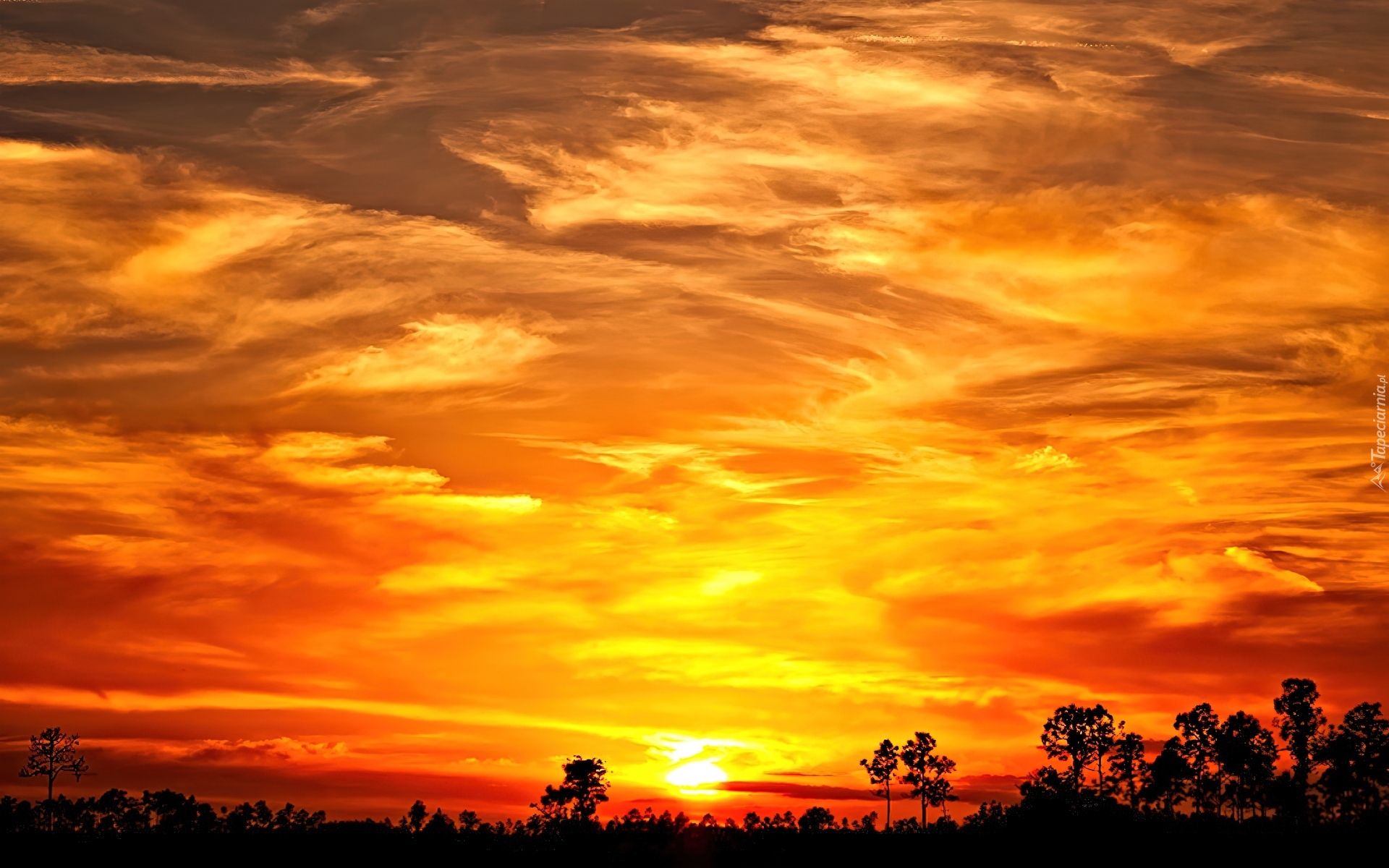 Edytor tapety: Zachód, Słońca, Chmury, Drzewa