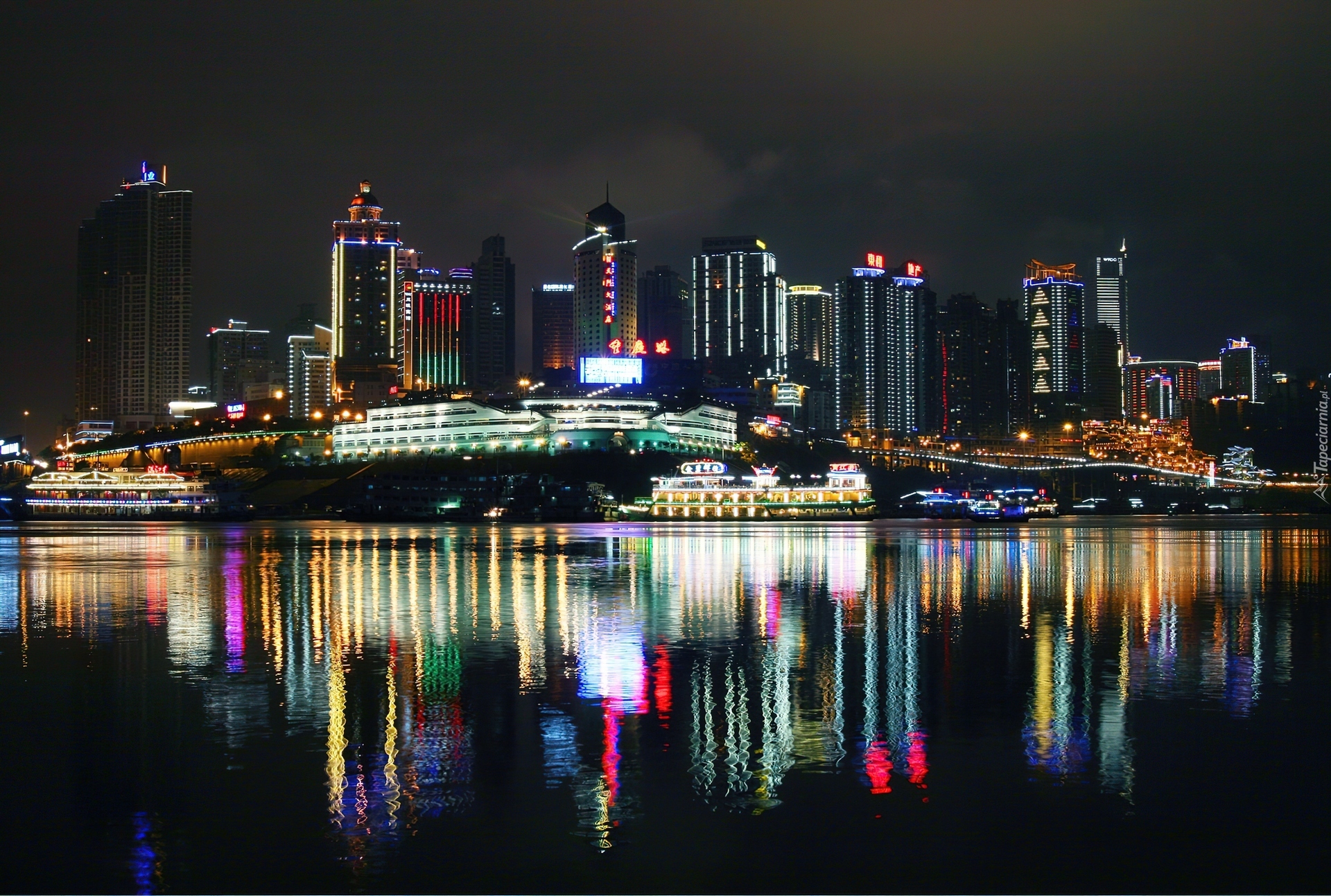 Edytor tapety: Oświetlona, Dzielnica, Nocą, Kolorowe, Światła, Odbicie