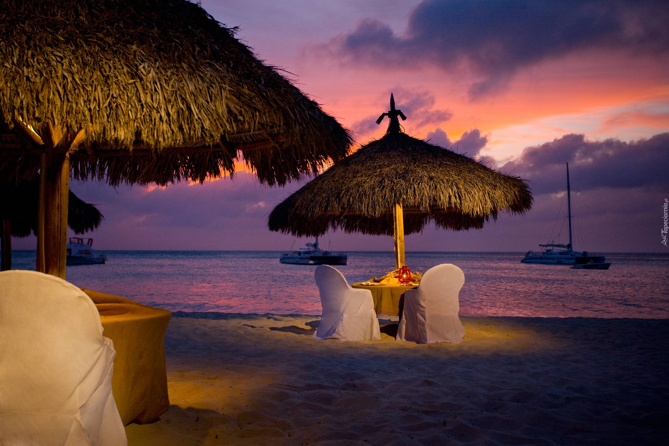 Edytor tapety: Zachód, Słońca, Morze, Plaża, Parasole, Romantyczna, Kolacja