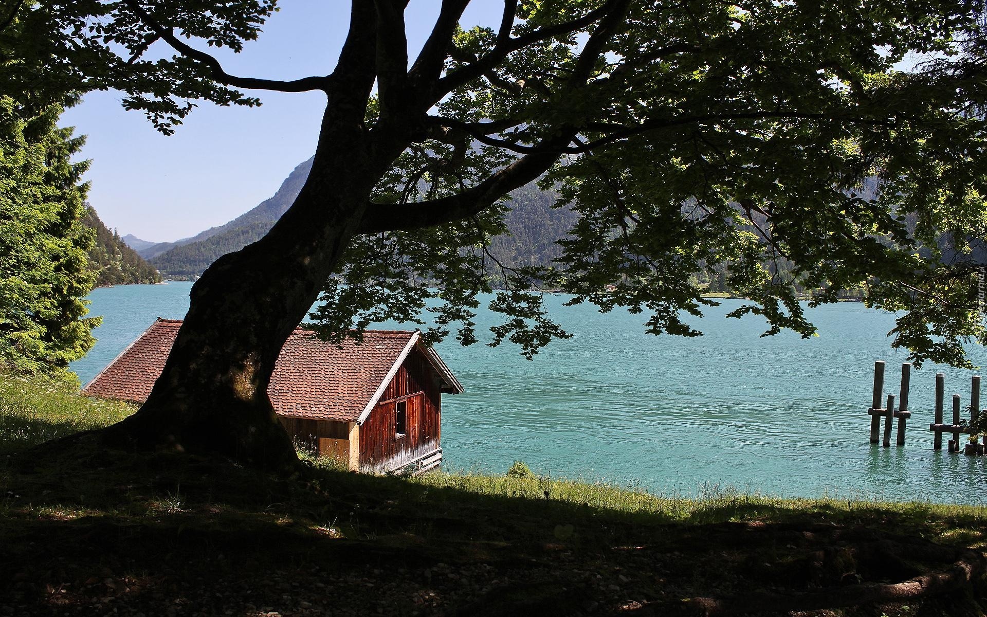 Edytor tapety: Jezioro, Domek, Góry, Drzewa