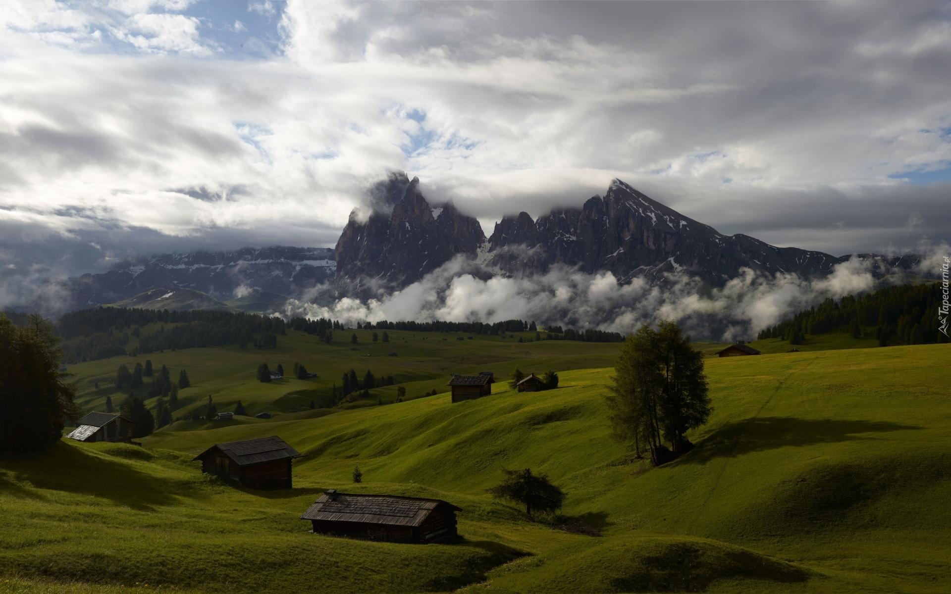 Edytor tapety: Góry, Chmury, Zielone, Łąki, Domki