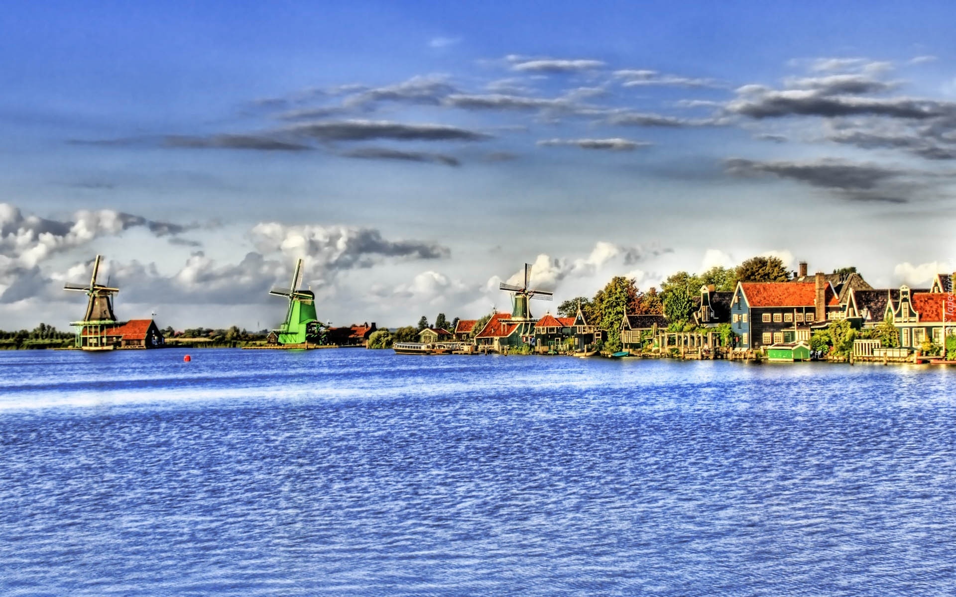 Edytor tapety: Wiatraki, Domki, Wybrzeże