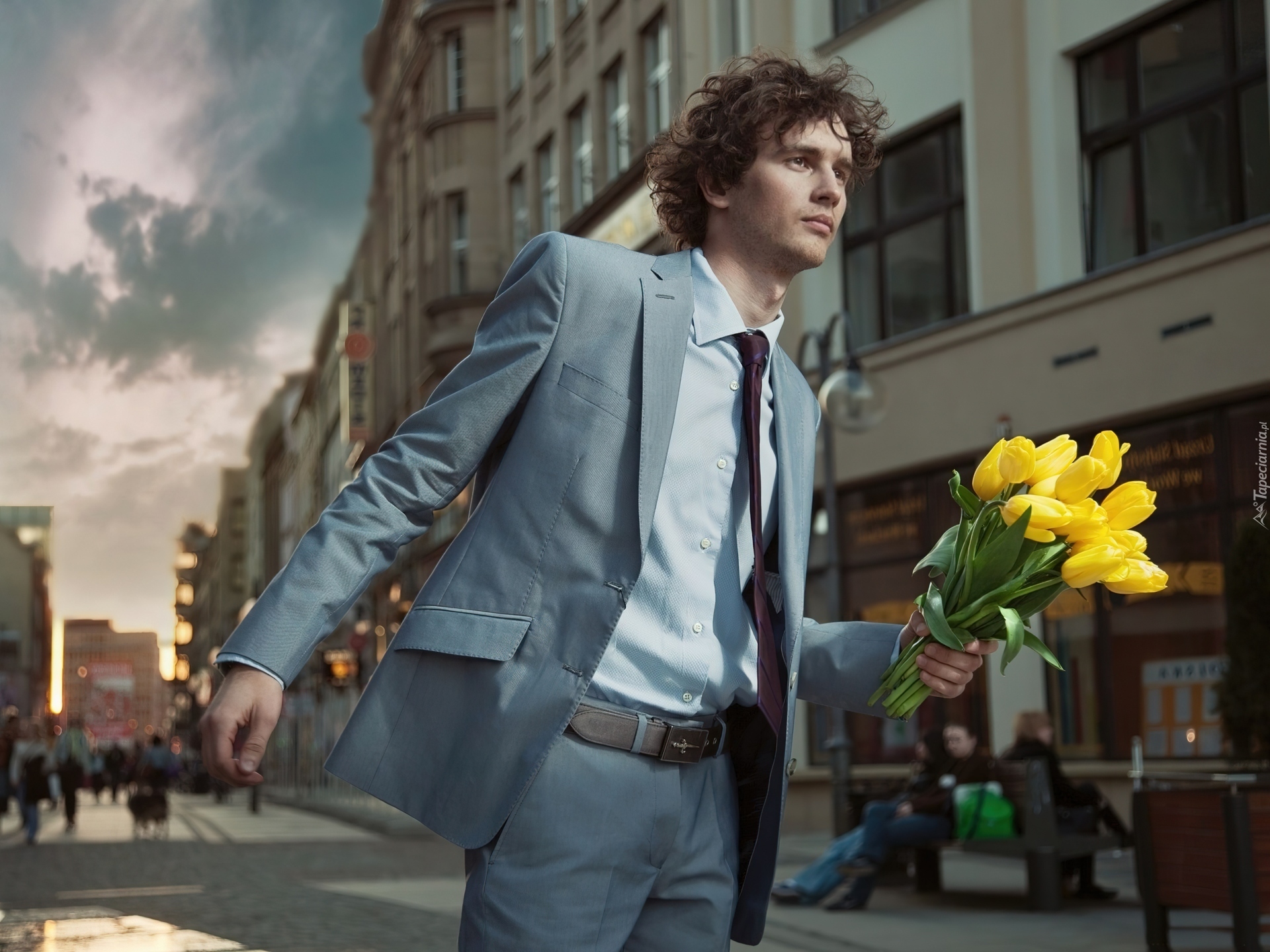 Edytor tapety: Miasto, Mężczyzna, Bukiet, Tulipanów