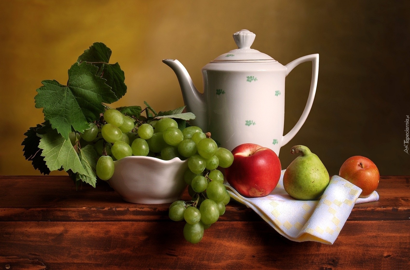 Edytor tapety: Porcelana, Dzbanek, Owoce, Serwetka