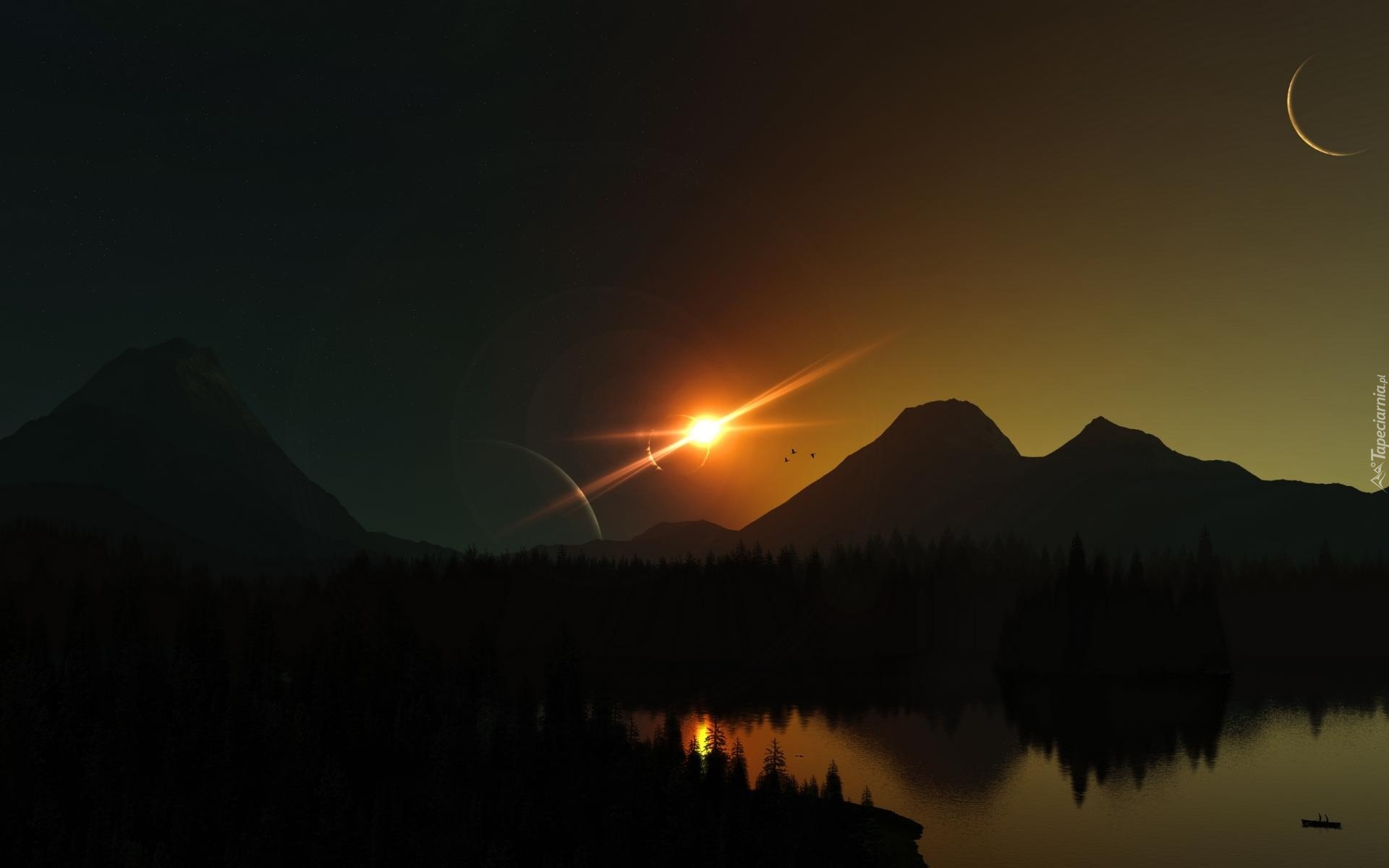 Edytor tapety: Zachód, Słońca, Góry, Jezioro
