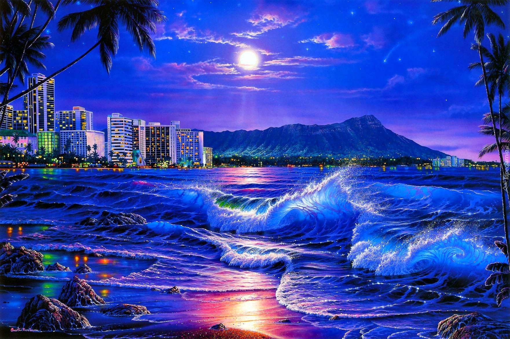 Edytor tapety: Fale, Wybrzeże, Miasto, Noc