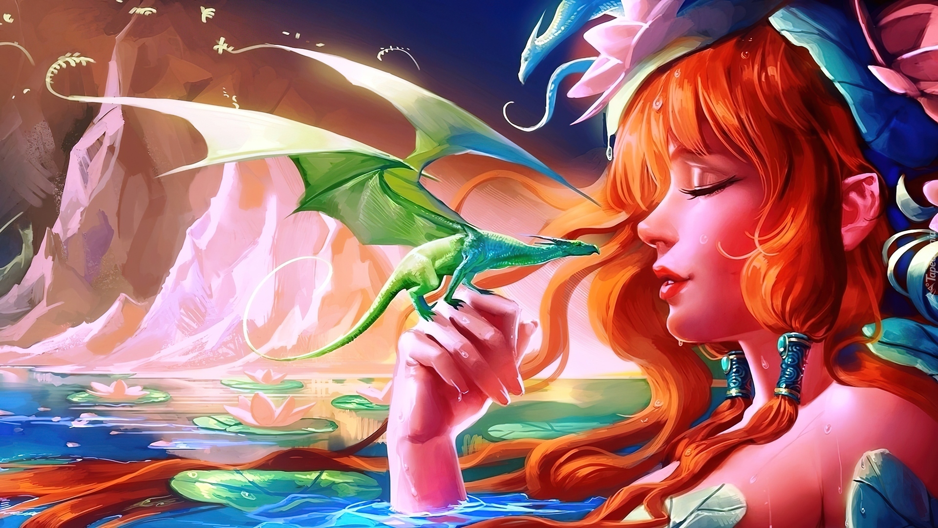Edytor tapety: Rudowłosa, Dziewczyna, Zielony, Smok