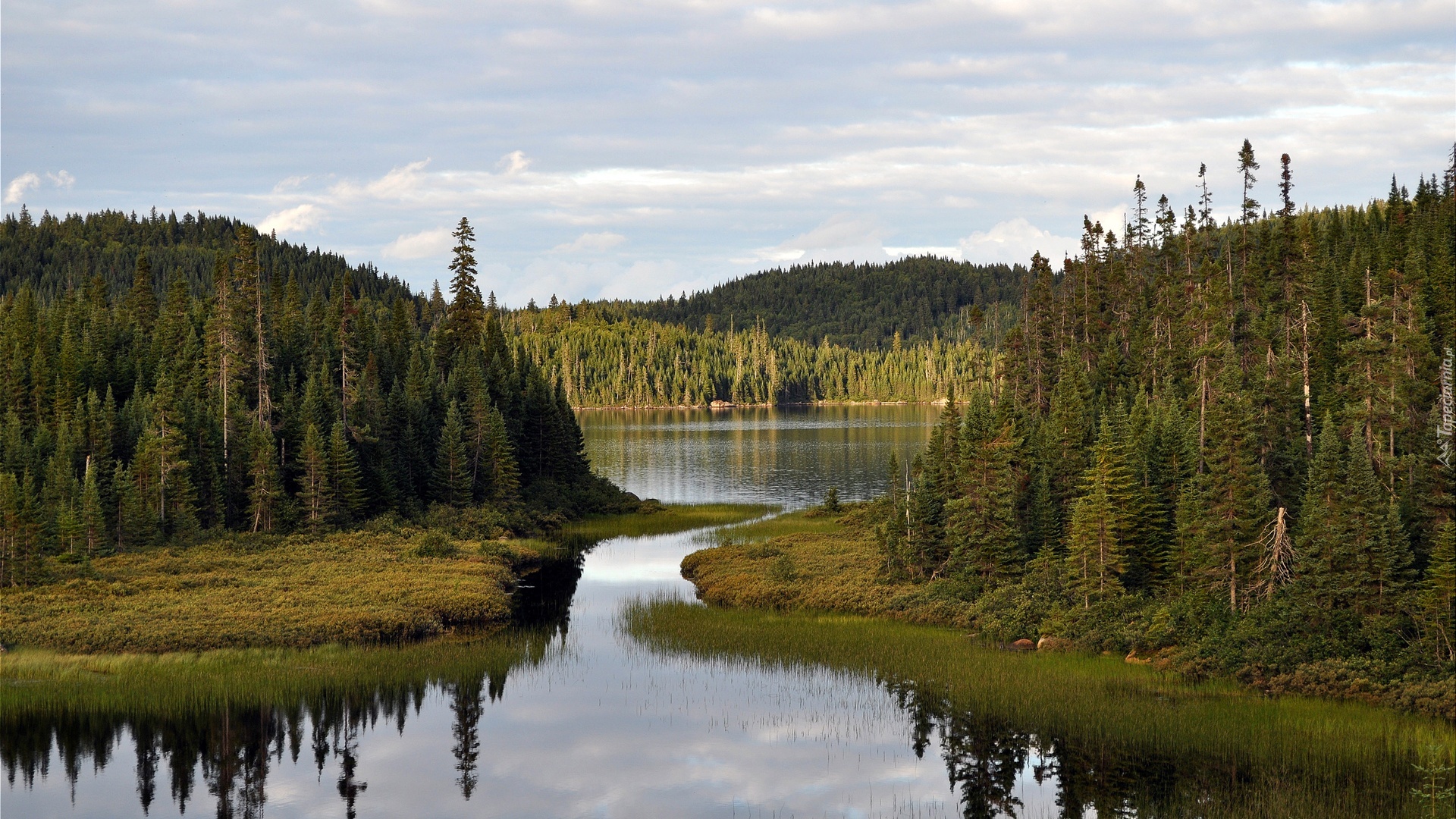 Edytor tapety: Jezioro, Lasy, Iglaste, Szuwary