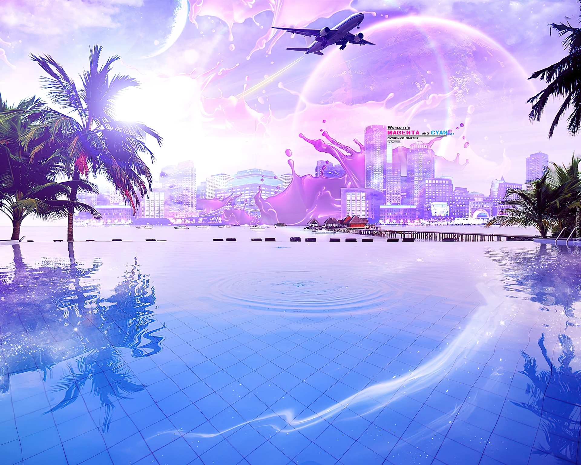 Edytor tapety: Miasto, Palmy, Samolot, Woda