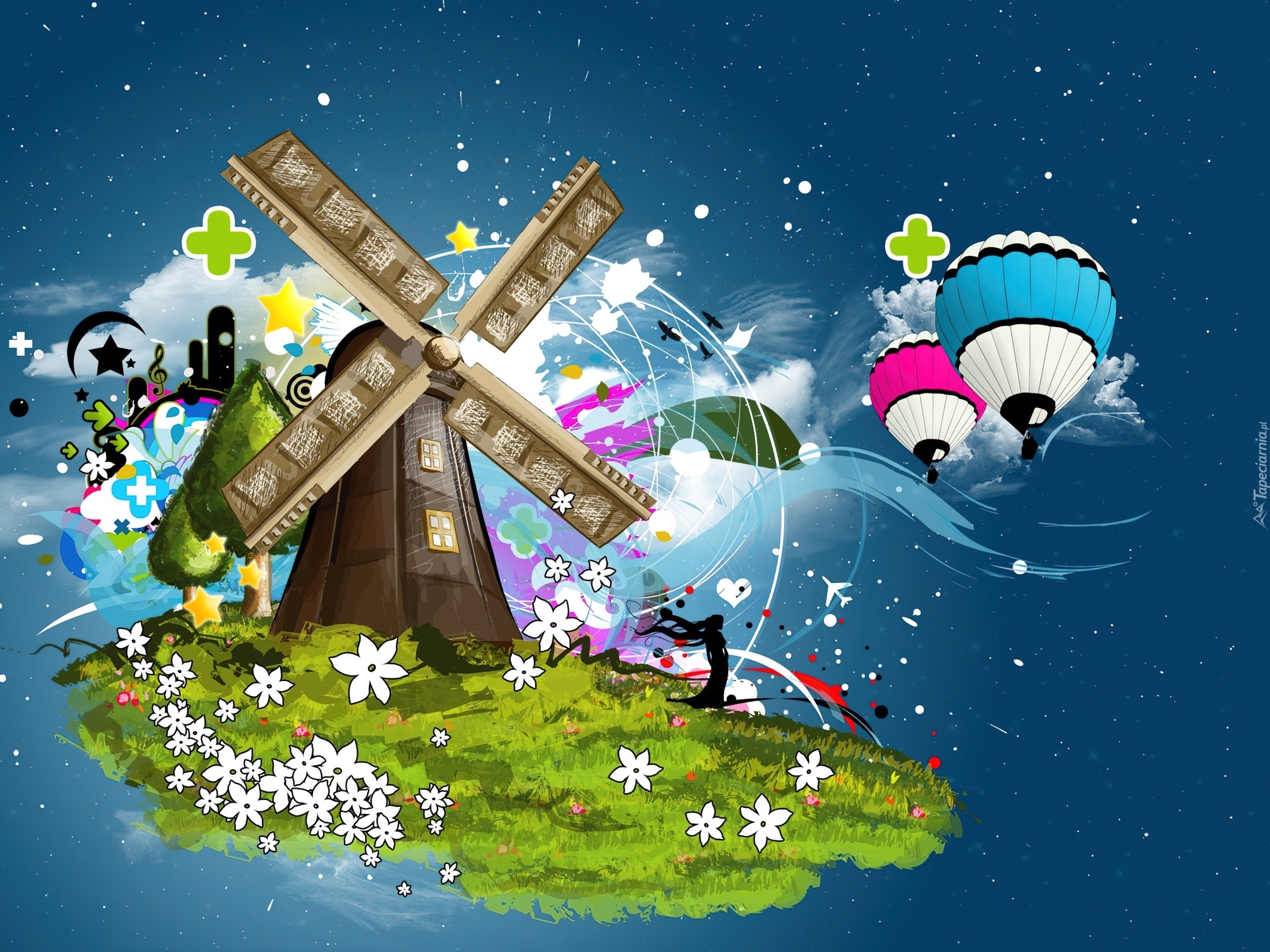Edytor tapety: Młyn, Balony, Niebo, Fantasy
