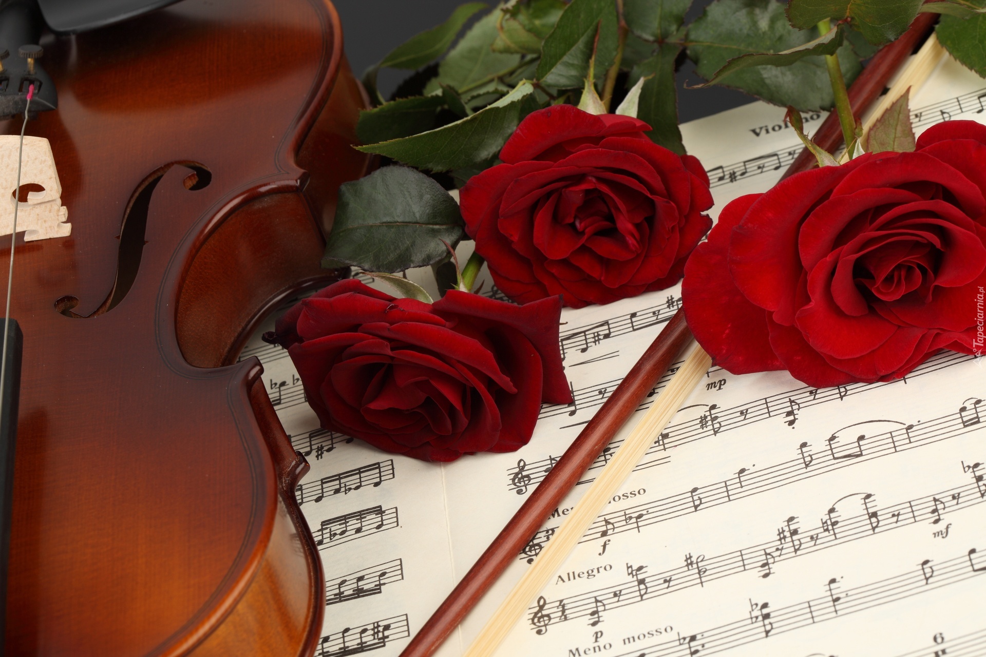 Edytor tapety: Skrzypce, Instrument, Muzyczny, Nuty, Róże