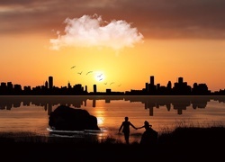 Edytor tapety: Zachód, Słońca, Miasto, Para