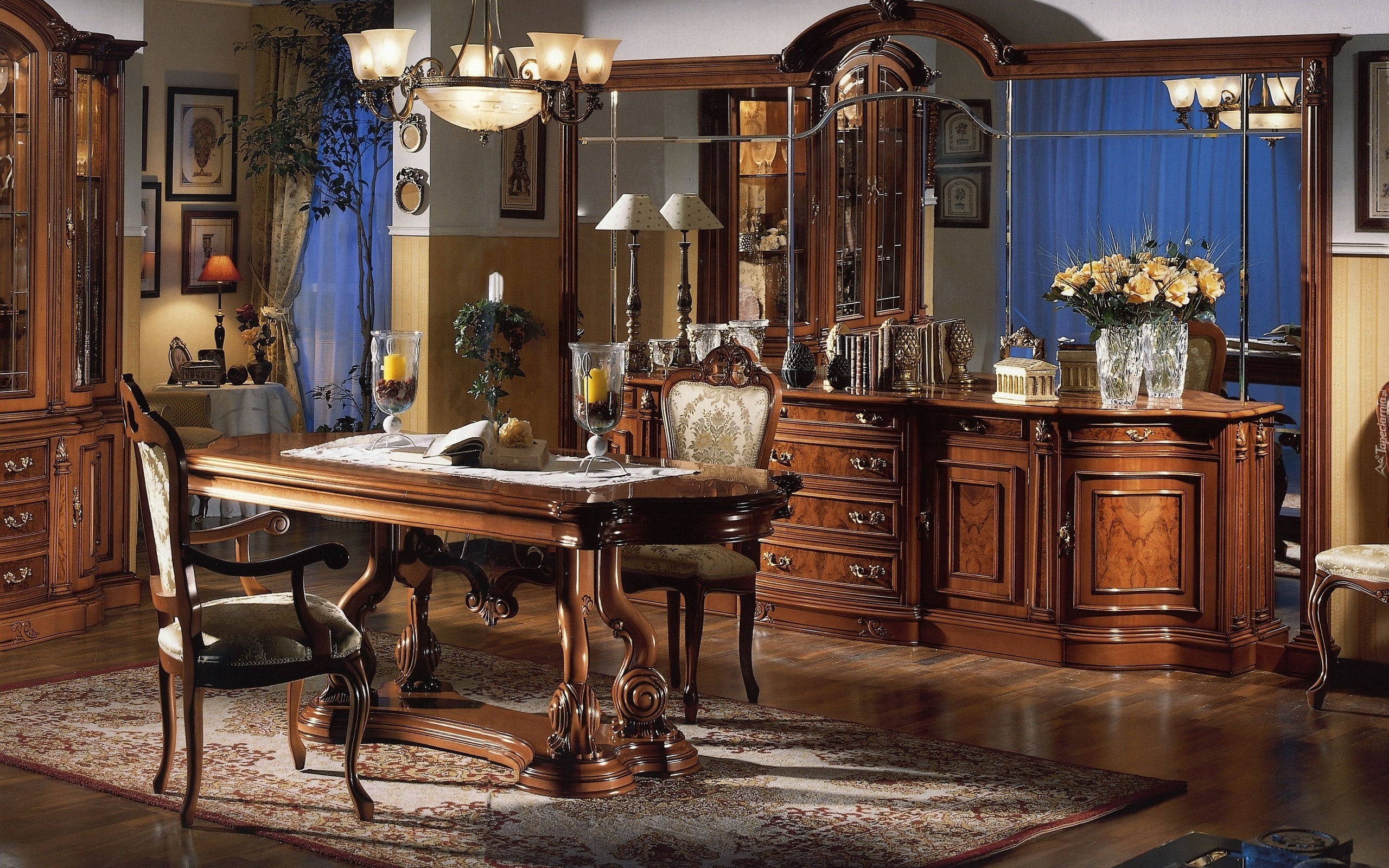Edytor tapety: Pokój, Stół, Krzesła, Komoda, Lustro, Wazony, Kwiaty, Żyrandol