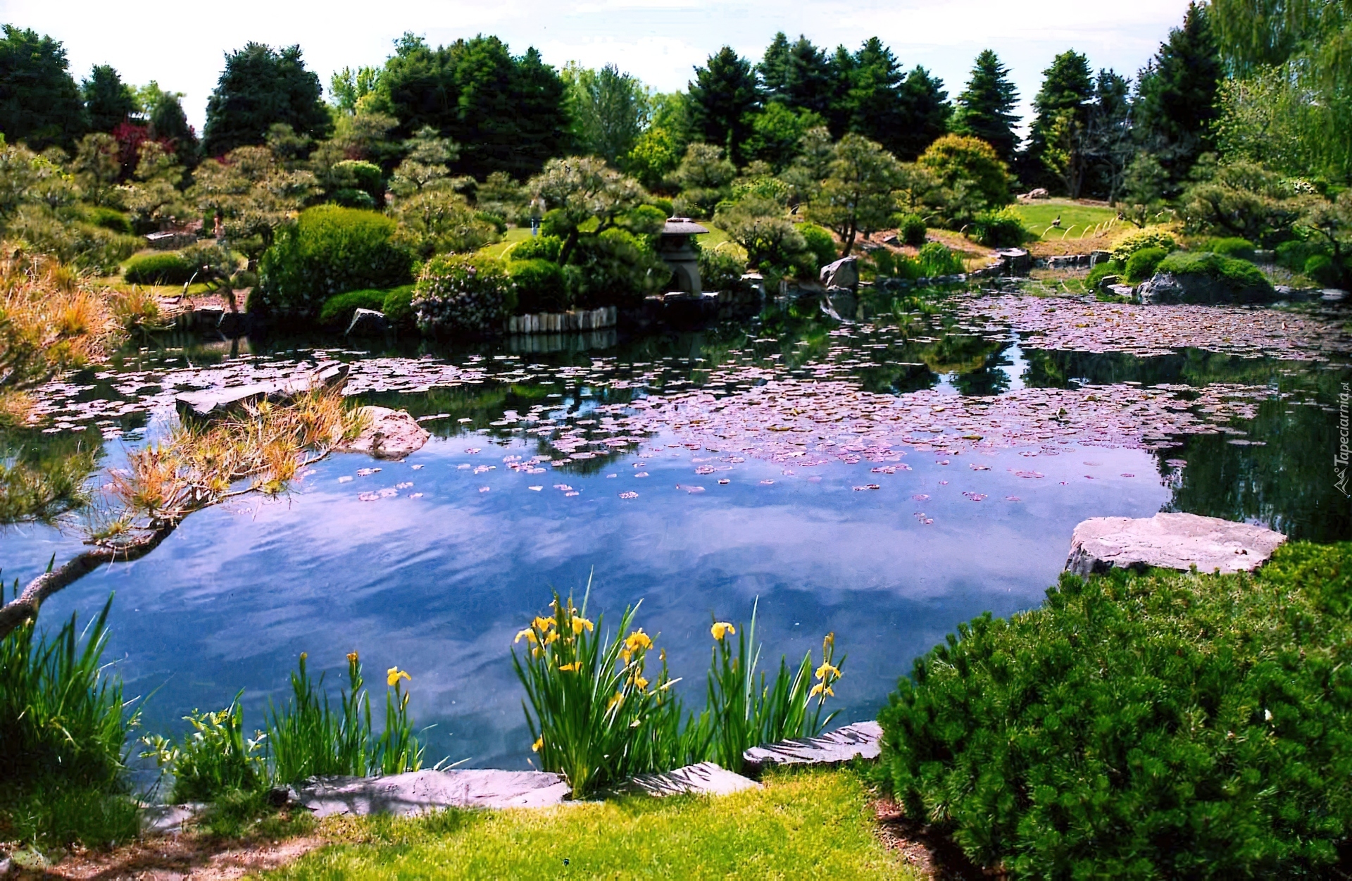 Edytor tapety: Ogród, Stawek, Kwiaty, Zieleń, Park, Lato