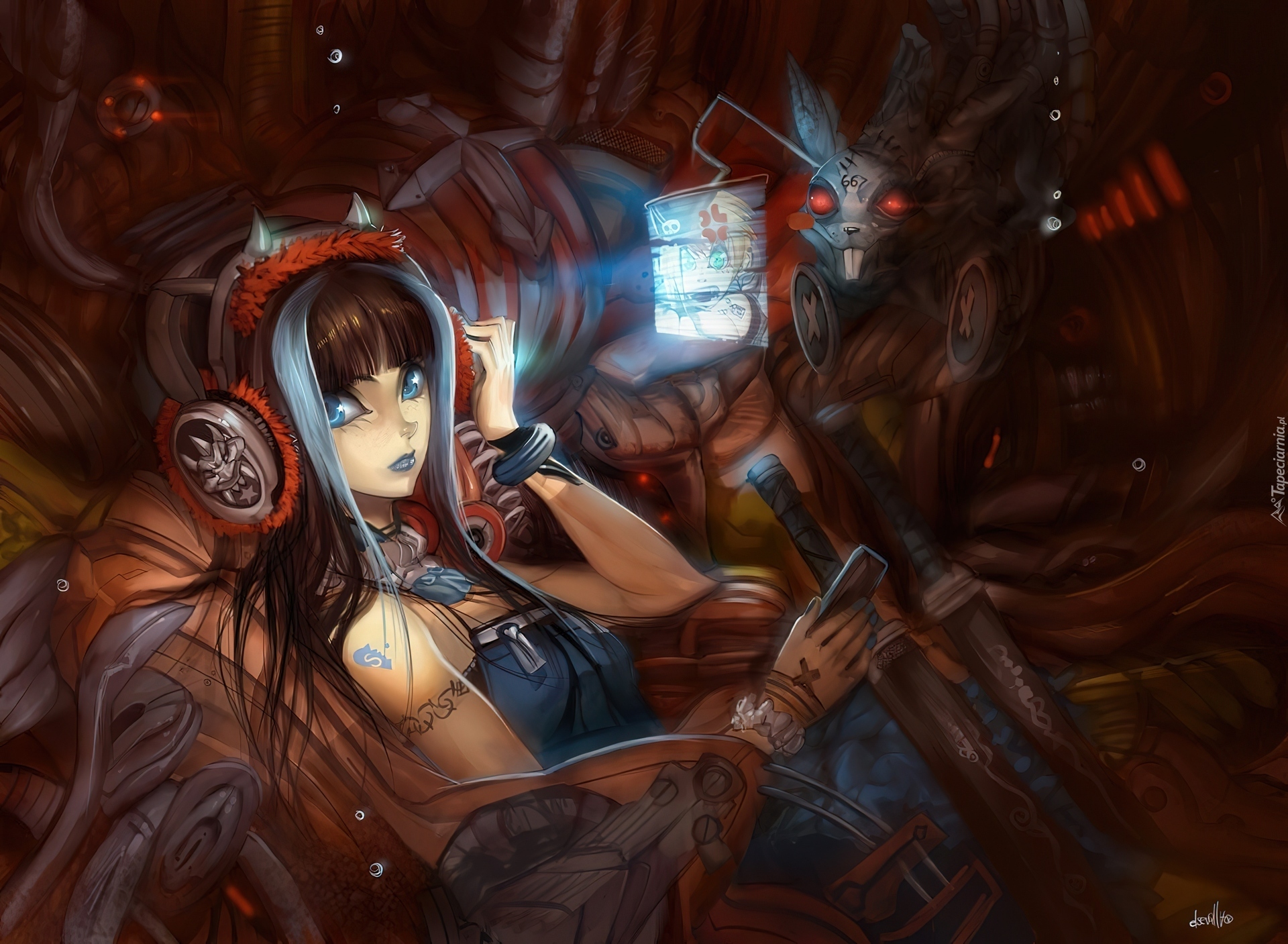 Edytor tapety: Dziewczyna, Słuchawki, Miecze