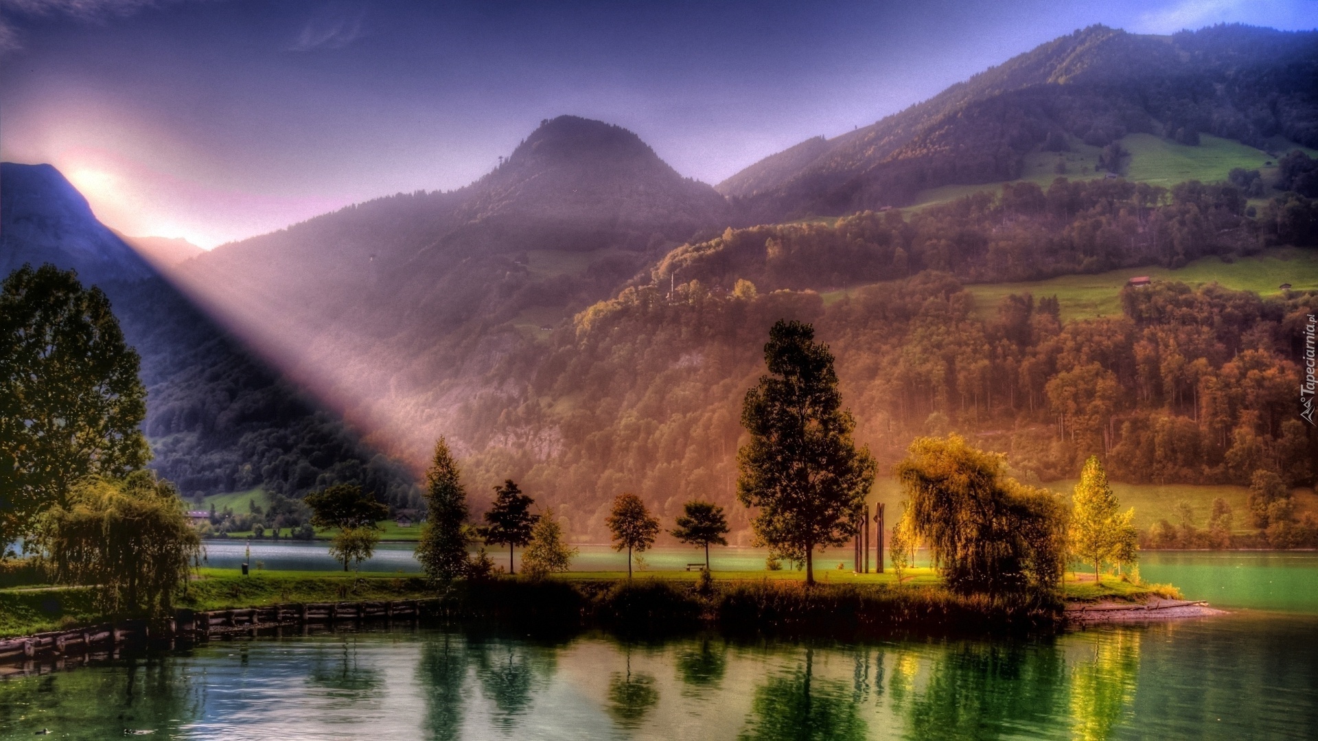 Edytor tapety: Rzeka, Drzewa, Góry, Przebijające, Słońce