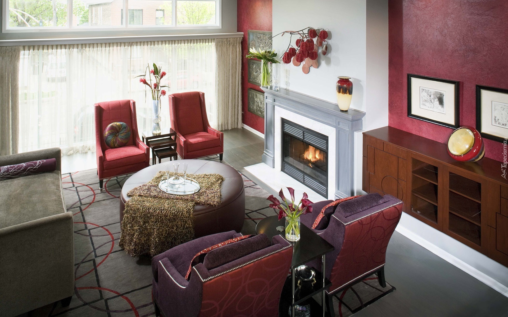 Edytor tapety: Pokój, Stolik, Fotele, Kominek, Obrazy, Kwiaty