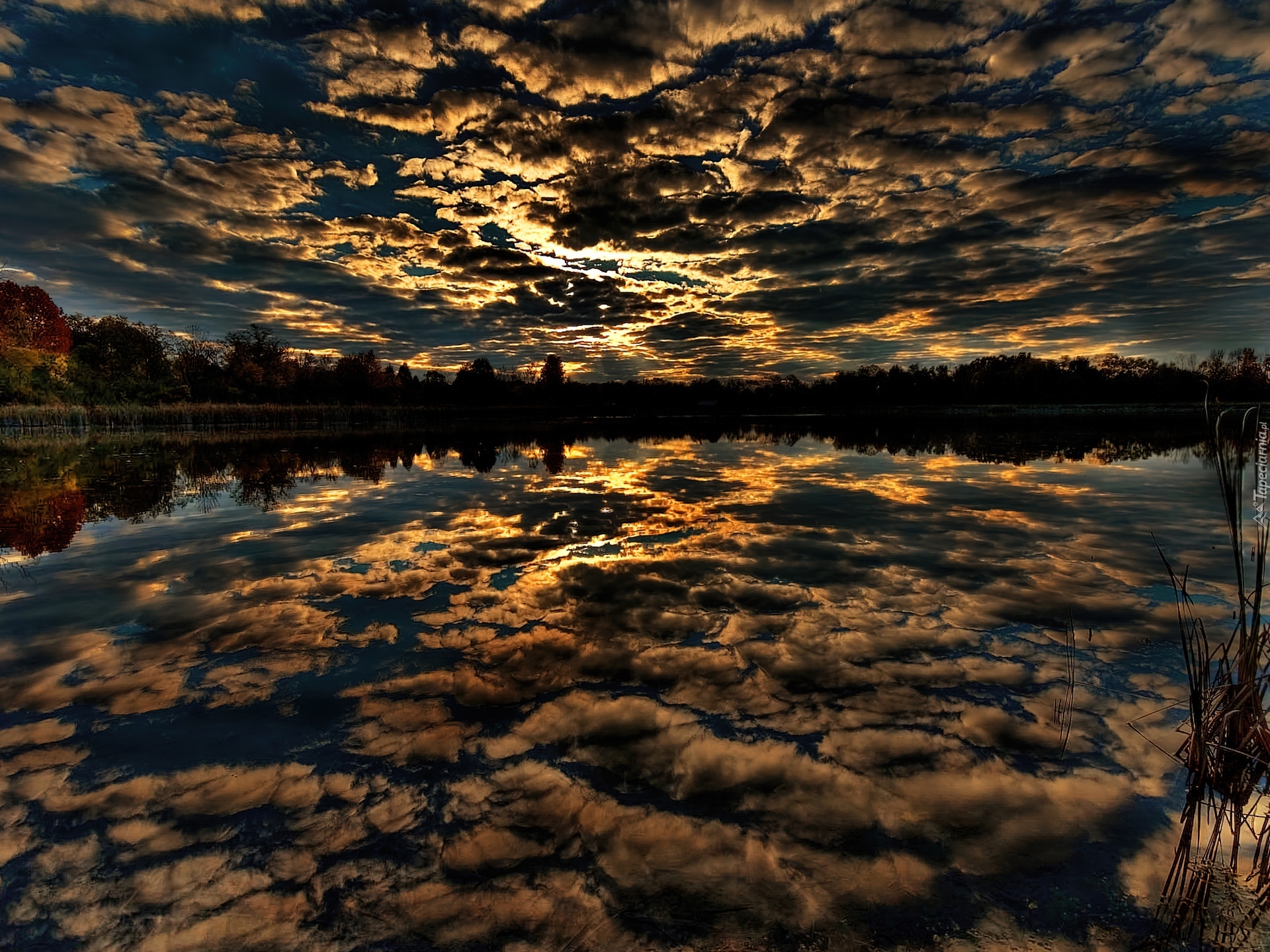 Edytor tapety: Zachód, Słońca, Chmury, Jezioro, Odbicie