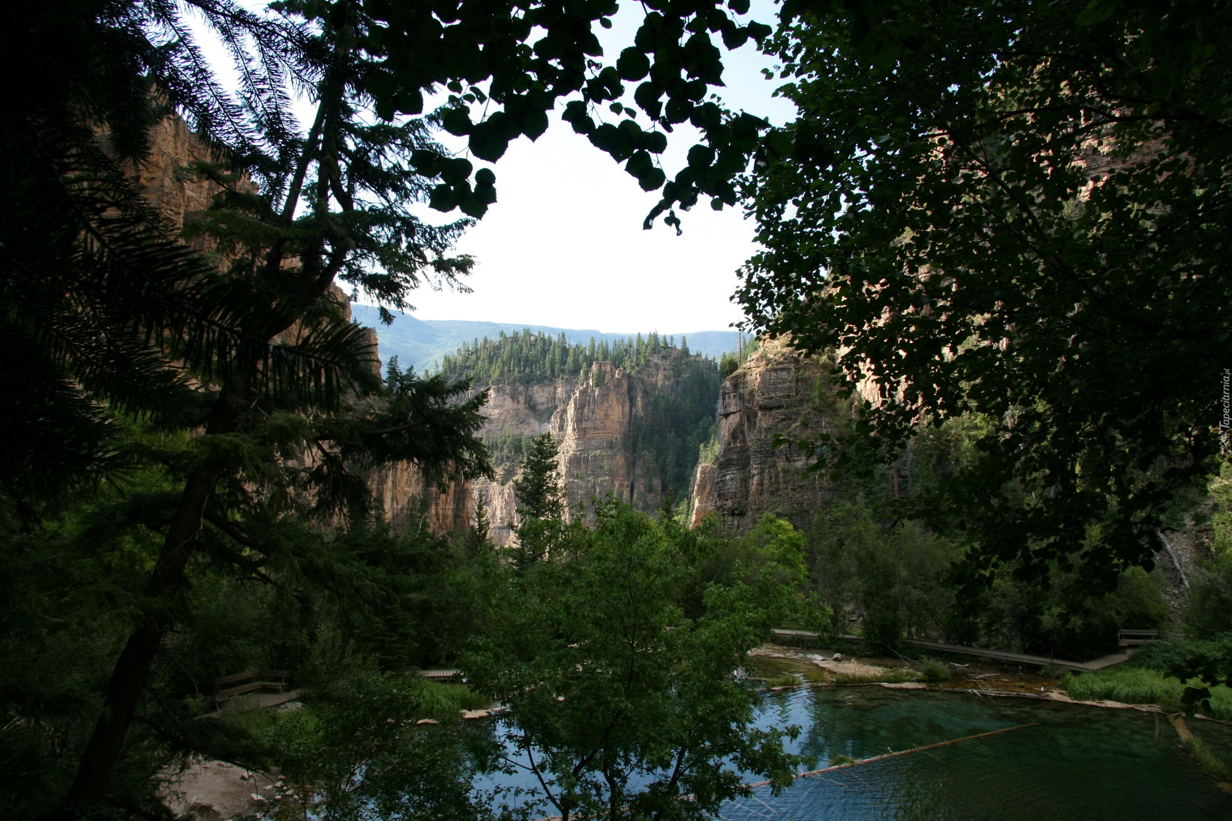 Edytor tapety: Staw, Drzewa, Góry, Mostek, Ławka