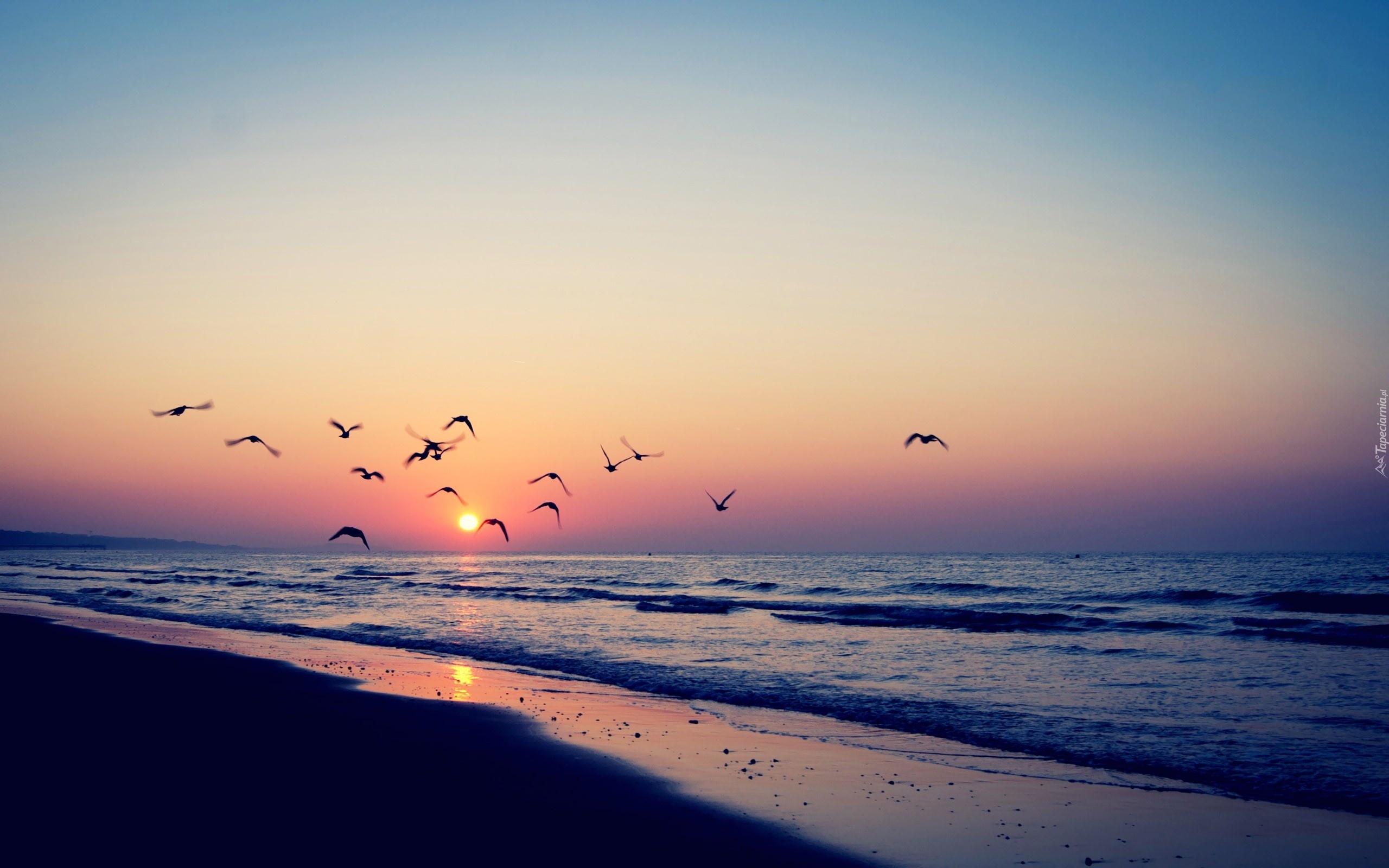 Edytor tapety: Zachód, Słońca, Ptaki, Morze