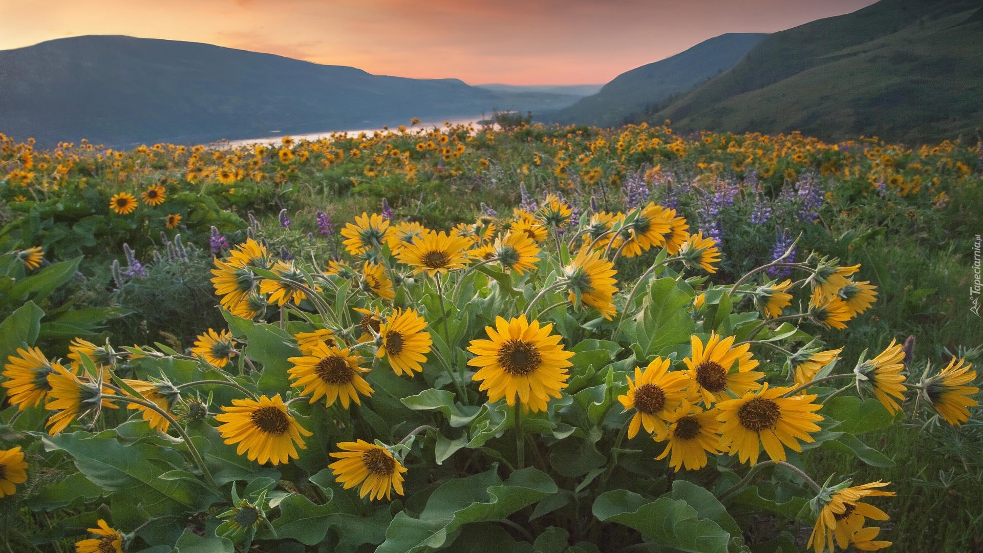 Edytor tapety: Rezerwat przyrody, Columbia River Gorge, Góry Kaskadowe, Rzeka, Columbia River, Żółte, Kwiaty, Balsamorhiza, Łubin, Zachód słońca, Łąka, Stan Waszyngton, Stany Zjednoczone
