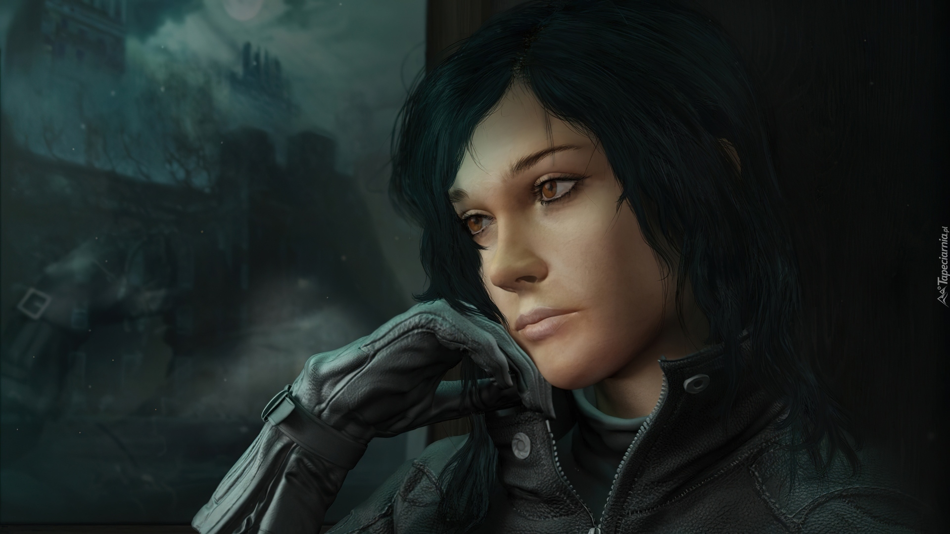 Edytor tapety: Zamyślona, Kobieta, Dłoń, Rękawica
