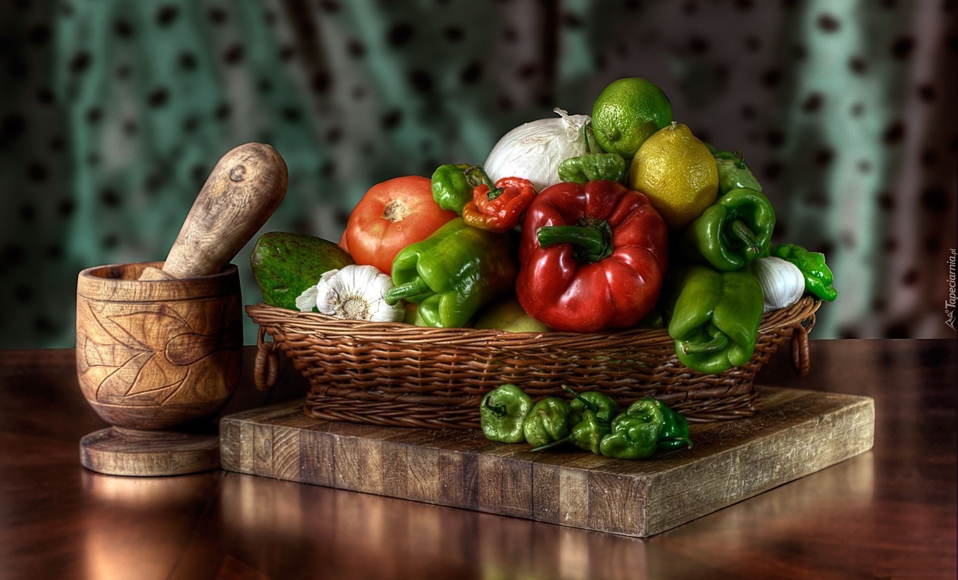 Edytor tapety: Drewniana, Deska, Kosz, Warzywa, Moździerz, Papryka
