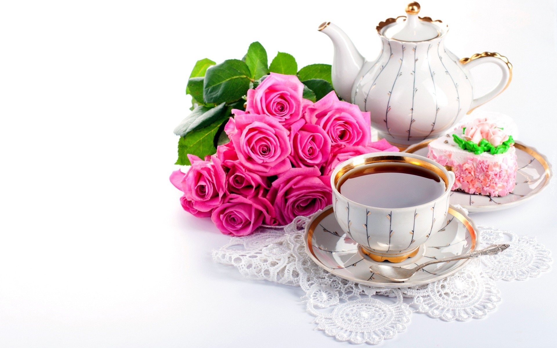 Edytor tapety: Bukiet, Róż, Ciastko, Herbata, Porcelana