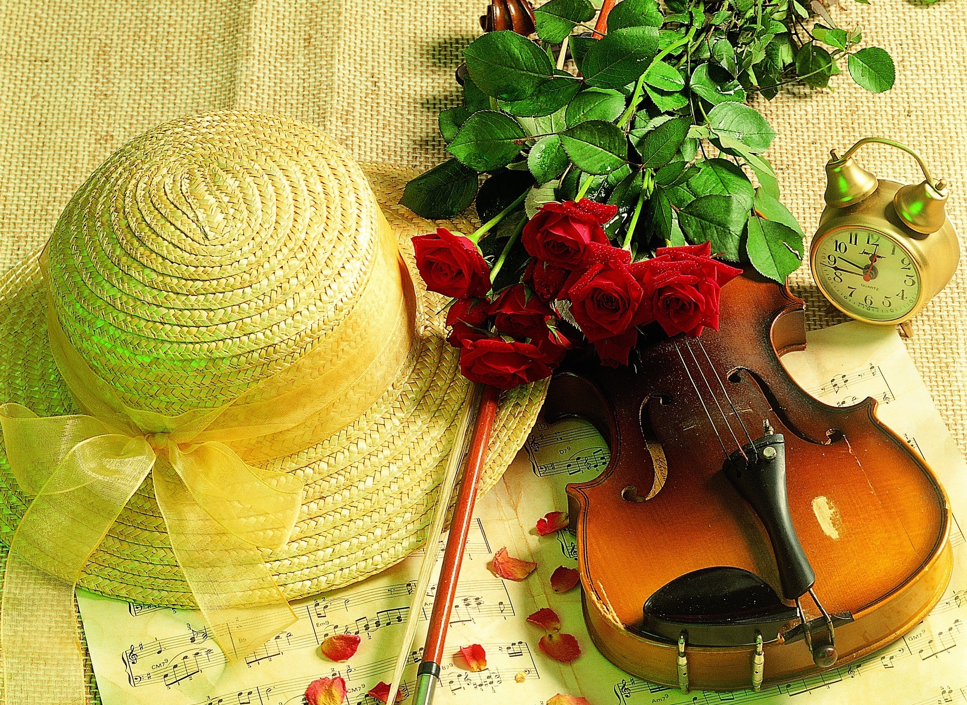Edytor tapety: Czerwone, Róże, Skrzypce, Kapelusz, Budzik