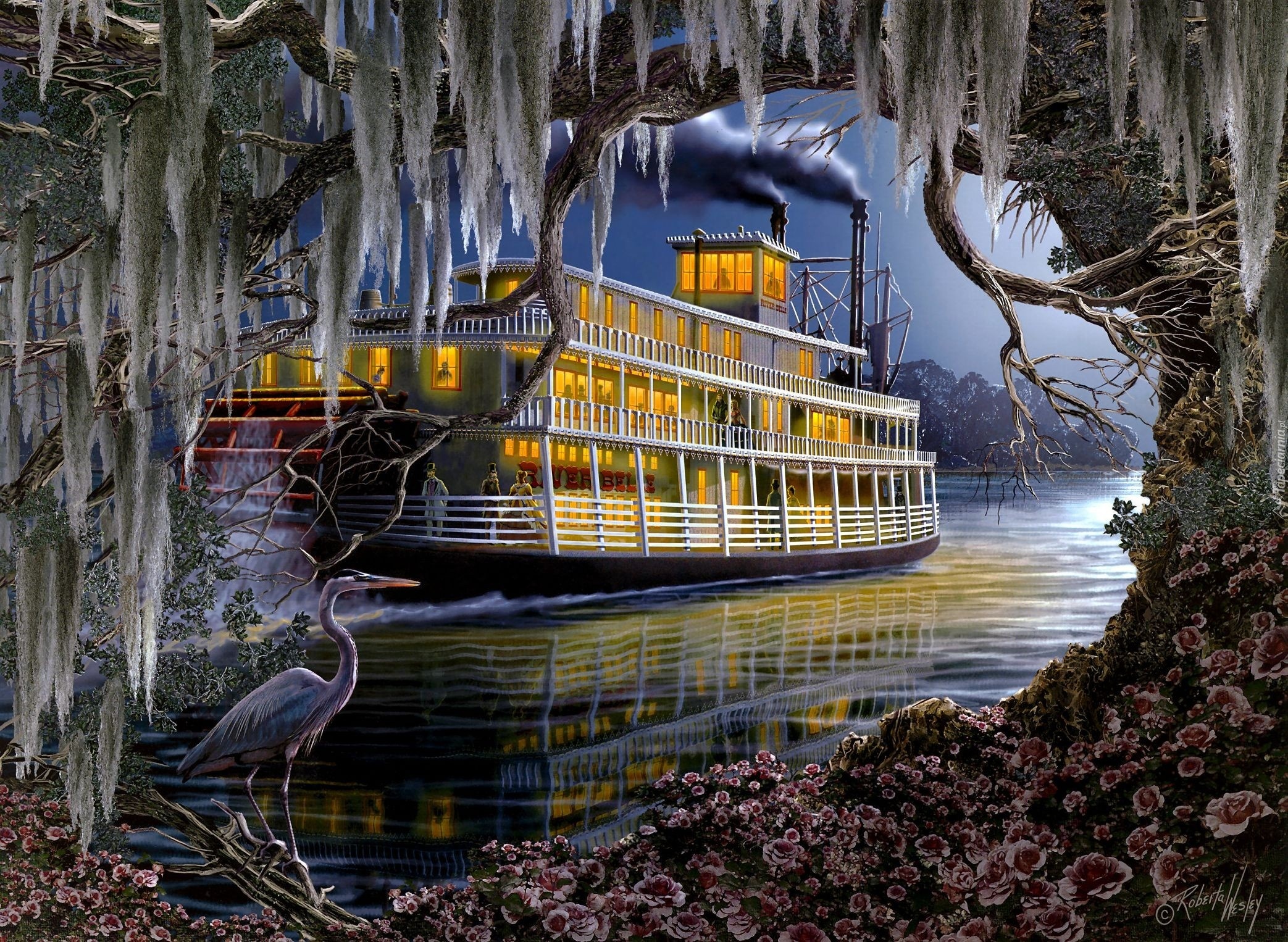 Edytor tapety: Obraz, Statek, Drzewo, Ptak, Woda
