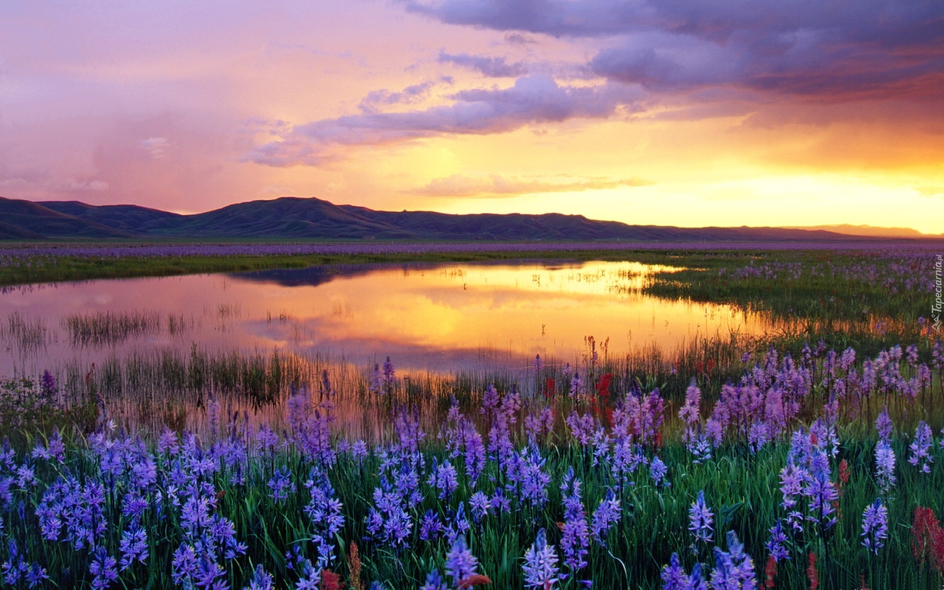 Edytor tapety: Łąka, Kwiaty, Zachód, Słońca