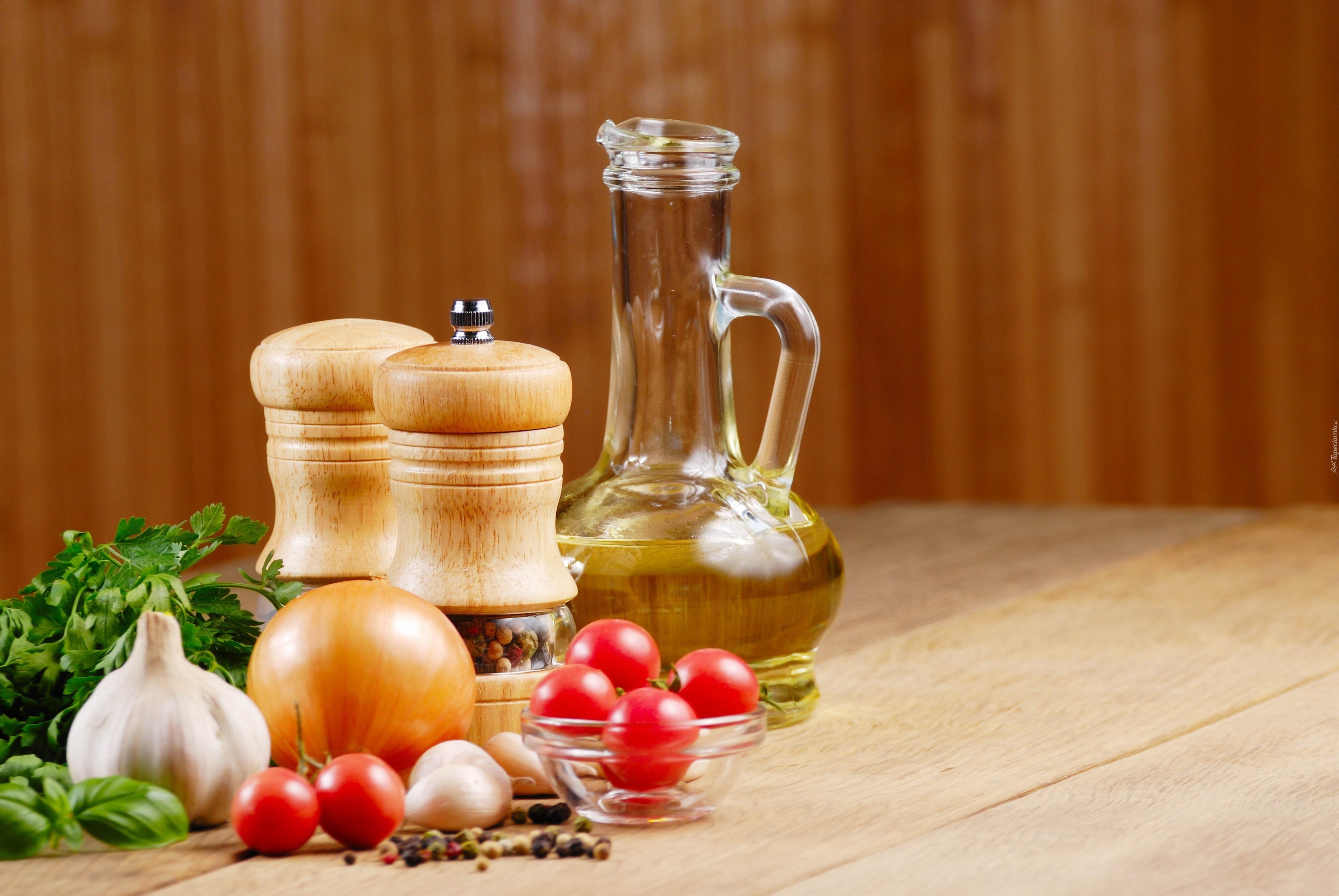 Edytor tapety: Olej, Sól, Pieprz, Pomidorki, Cebulka, Czosnek